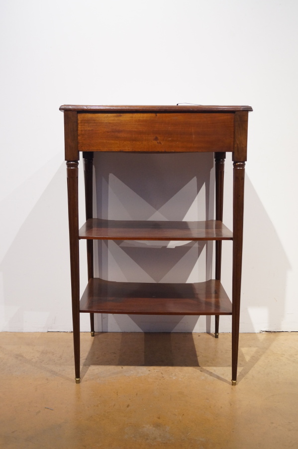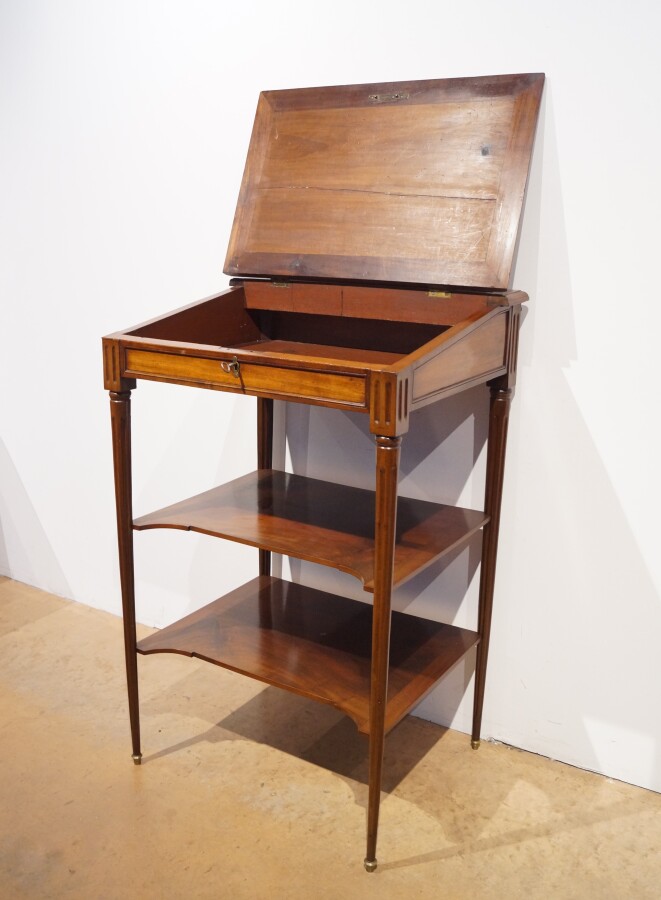 Attribué à Jean CAUMONT (reçu Maître en 1774) : Meuble à écrire debout Louis XVI en acajou et placage d'acajou, le plateau gainé de cuir noir en l'état ouvrant à un abattant, compartiments pour plumes et encriers certains avec doublures en cuivre, piétement fuselé et cannelé relié par 2 tablettes rapportées, estampillé sur une traverse au-dessous "JME" et "...MONT", 76 x 60 x H. 117 cm (avec une clé, plateau et doublures en cuivre en l'état).