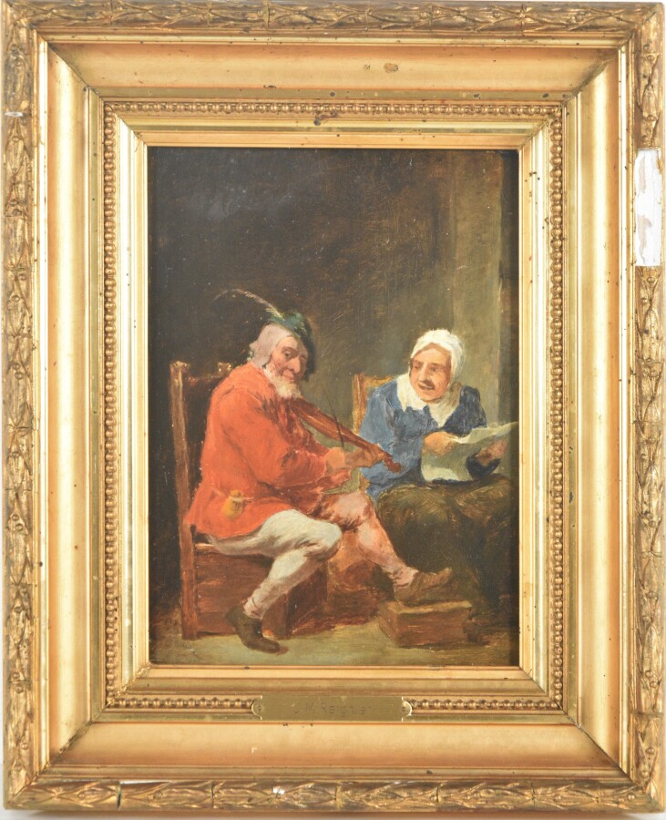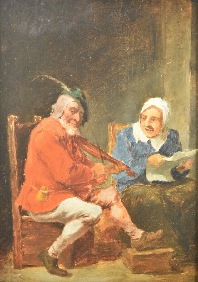 Attribué à Jean Marie REIGNIER (1815-1886), "Le musicien", huile sur panneau, traces de signature en haut à gauche, 15.5 x 22 cm (petites usures).