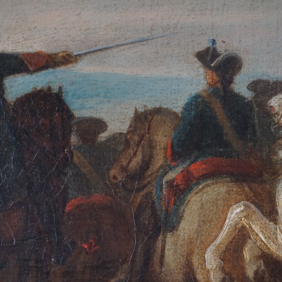 Attribué à Joseph PARROCEL (Brignoles 1646 - Paris 1704), "Scène de bataille", huile sur panneau non signée, 27.5 x 35.5 cm (quelques écaillures en bas à gauche et à droite).