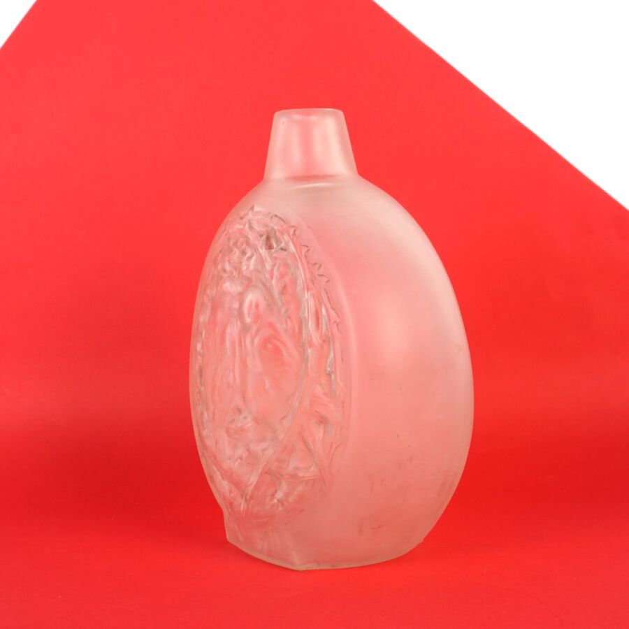 Attribué à LALIQUE FRANCE : Vase de forme gourde, modèle "Deux moineaux bavardant", en verre moulé pressé à décor en relief de deux oiseaux branchés sur une face, signature probablement apocryphe sous la base, H. 20 cm (légers éclats au col, rayures d'usage).