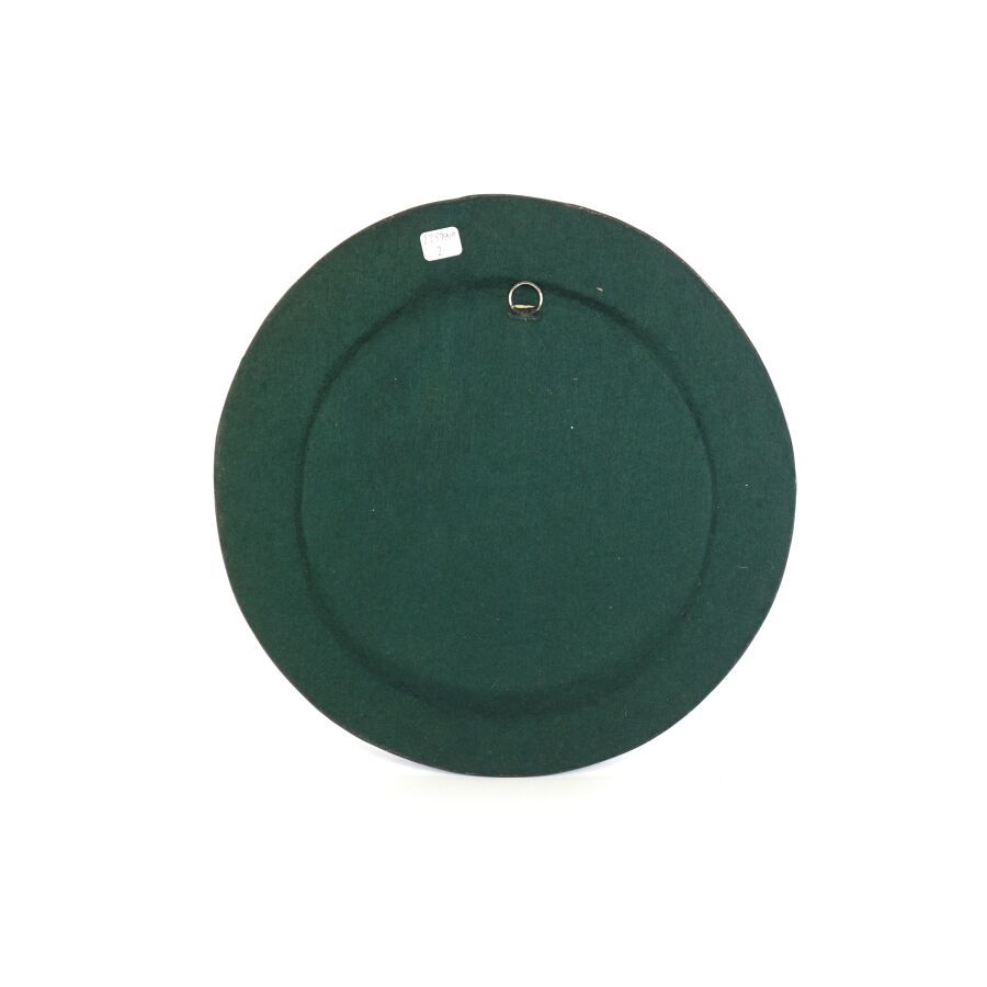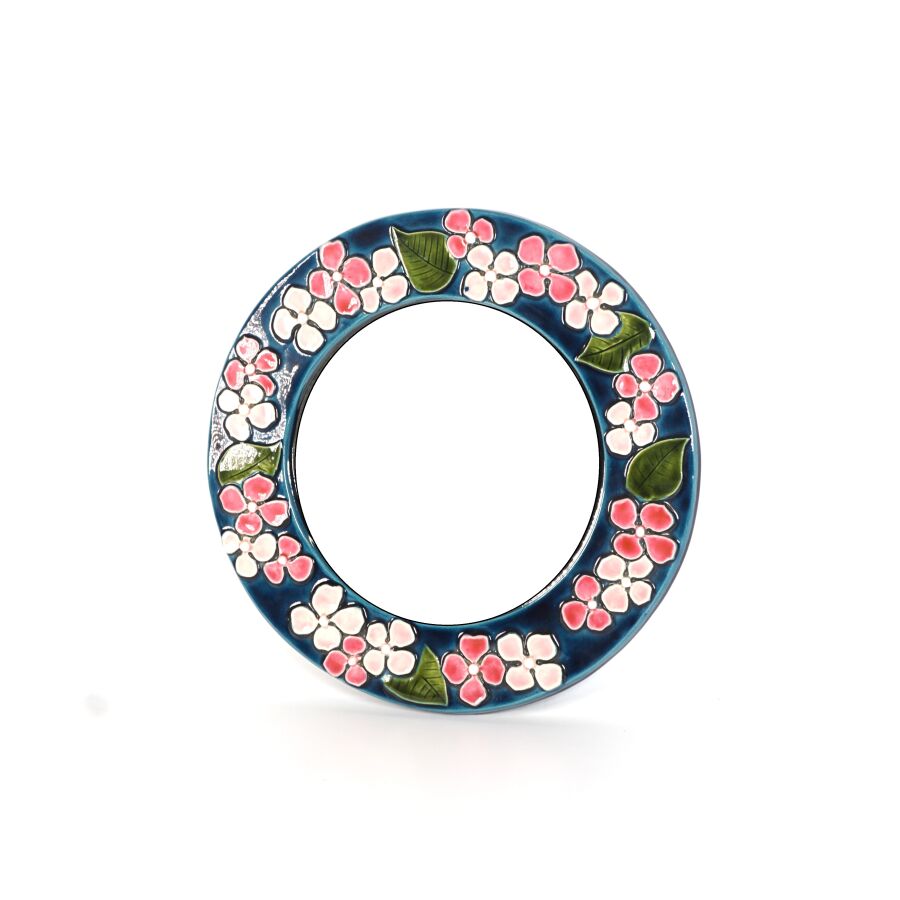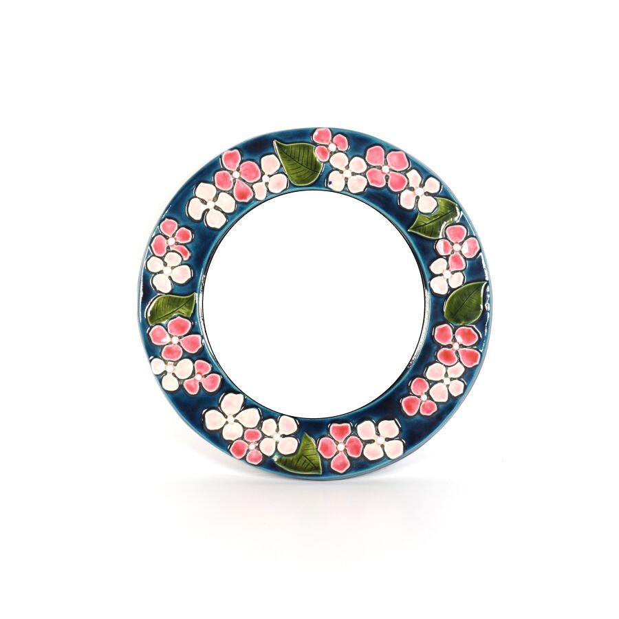 Attribué à Mithé ESPELT (1923-2020), Miroir circulaire en céramique émaillée rose, vert et beige sur fond bleu foncé à décor de fleurs et feuillages, D.32,5 cm.