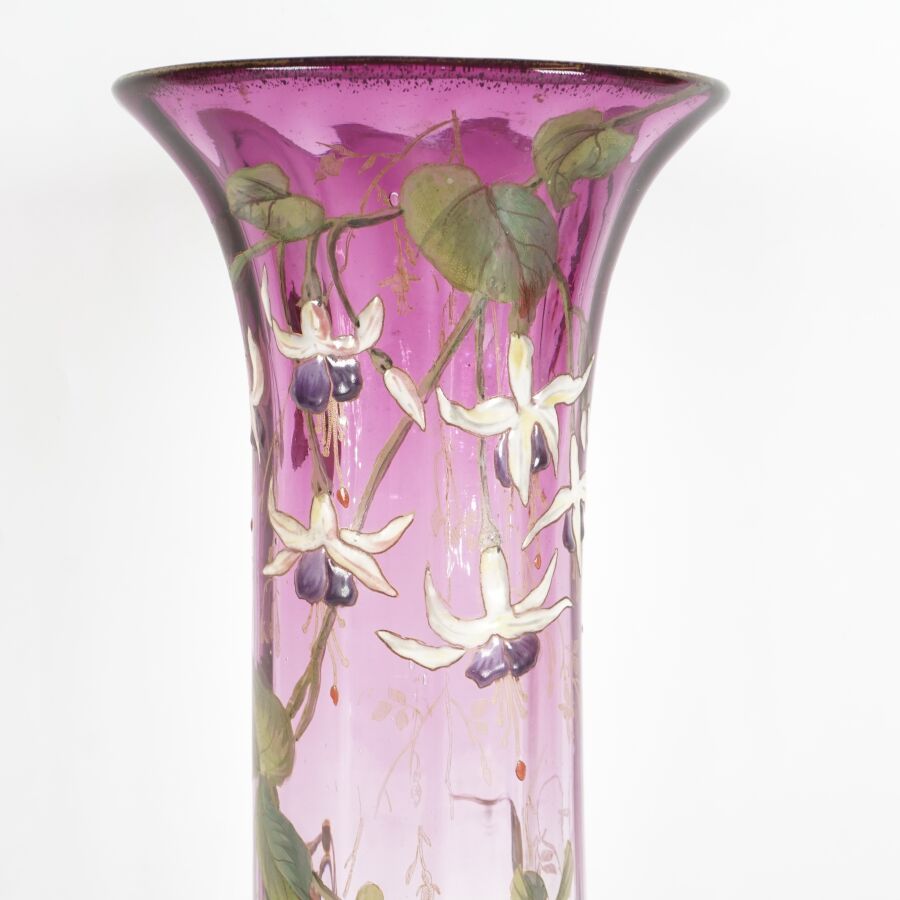 Attribué à MONTJOYE - LEGRAS /violet: Vase en verre soufflé incolore et teinté rose à décor émaillé polychrome de fuchsias et rehauts d'or, H. 35.5 cm.