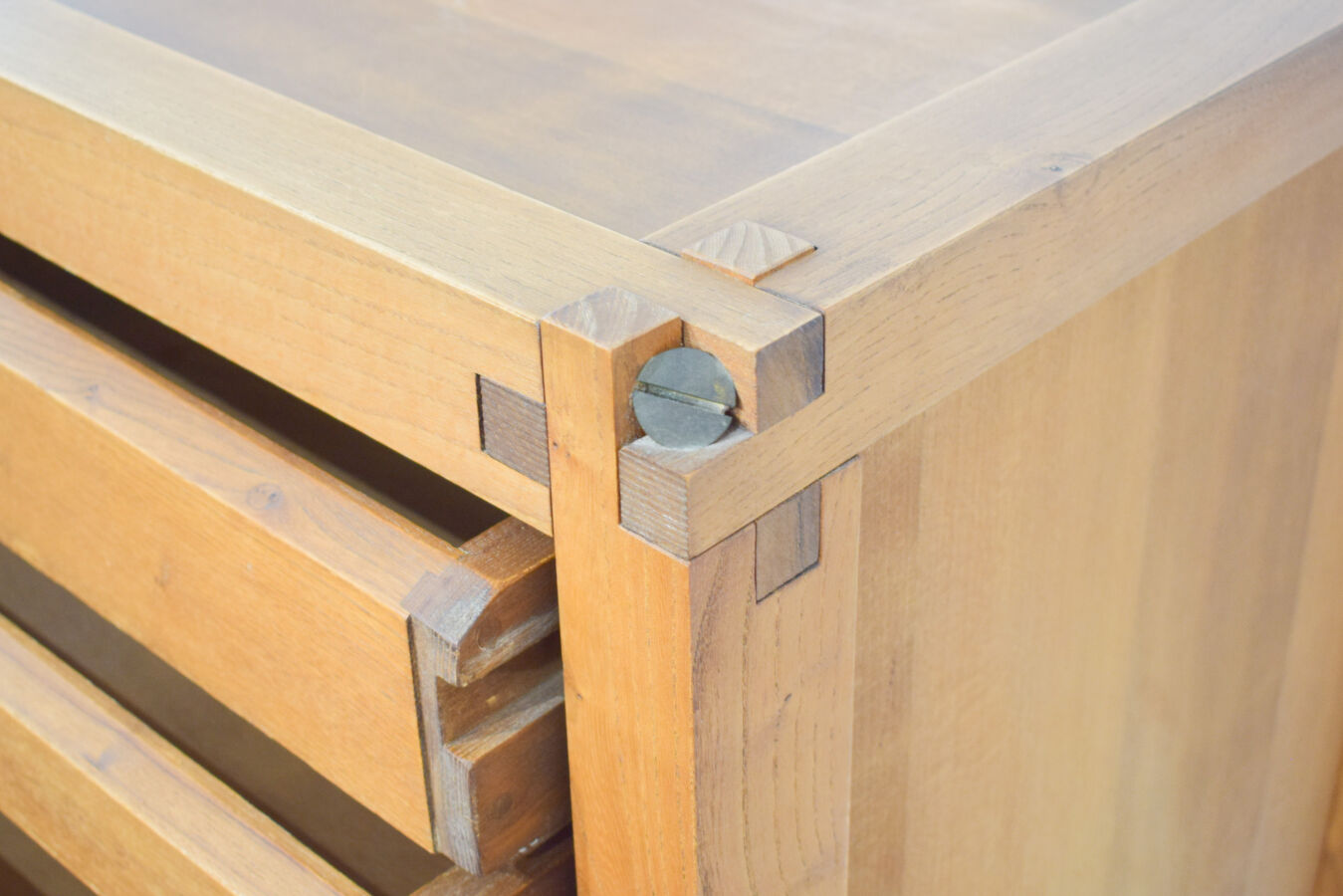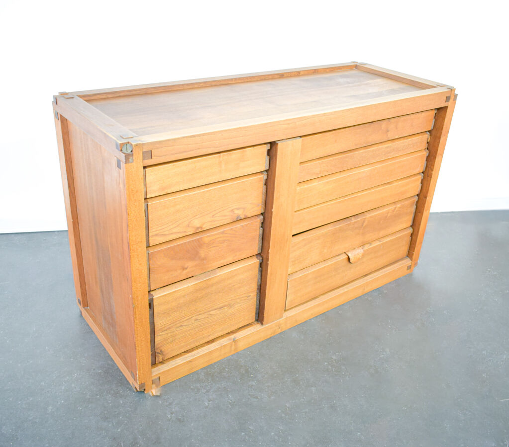 Attribué à Pierre CHAPO (1927-1987) : Commode en orme massif, à corps quadrangulaire ouvrant par dix tiroirs en façade de hauteurs et longueurs différentes, Haut. 82 cm. Long. 134 cm. Larg. 82 cm.
