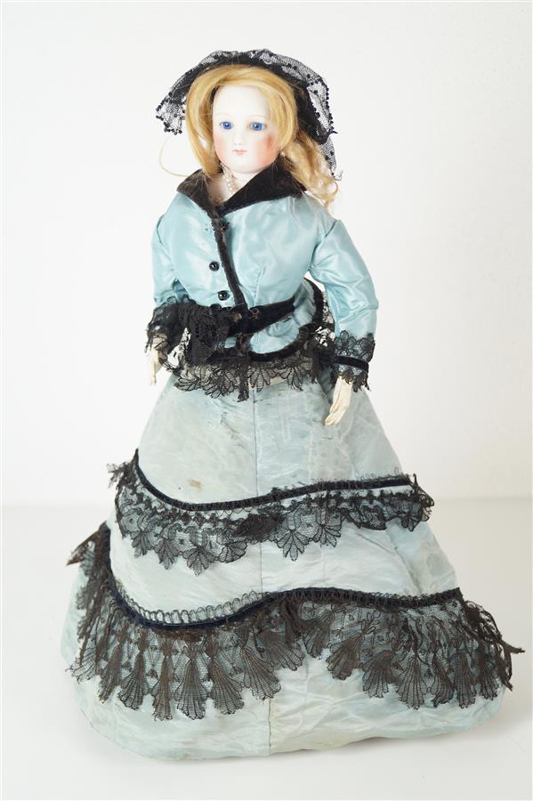 Attribuée à BARROIS : Jolie poupée parisienne, tête pivotante et buste en biscuit, yeux bleus émaillés en amande, joli corps en peau position assise, doigts détachés, habits de style, H. 40 cm.