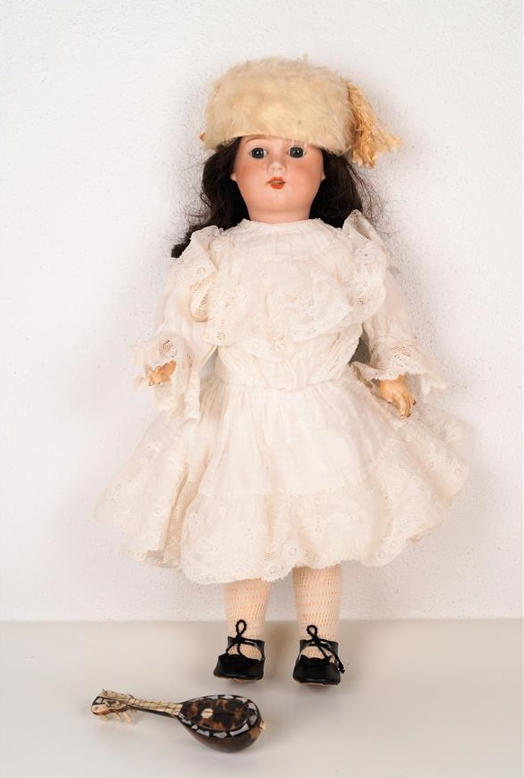 Attribuée à FLEISCHMANN : Poupée tête porcelaine marquée "2 X", corps semi articulé marcheur, habits et perruque, H. 44 cm. On joint une mandoline en écaille.