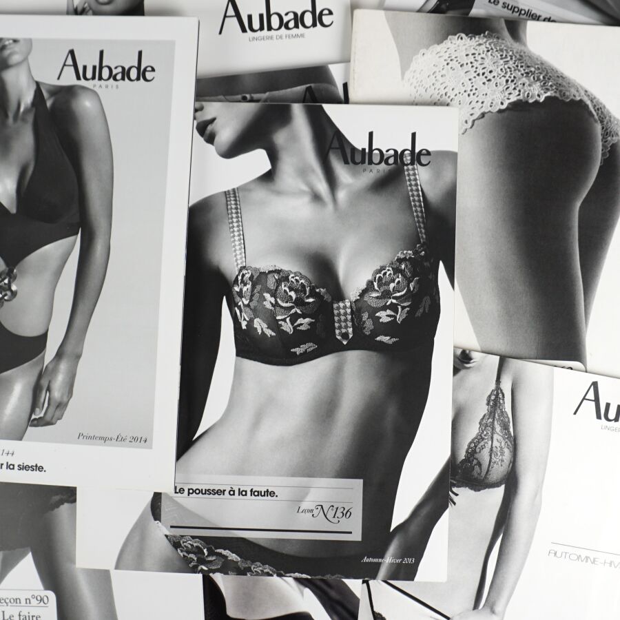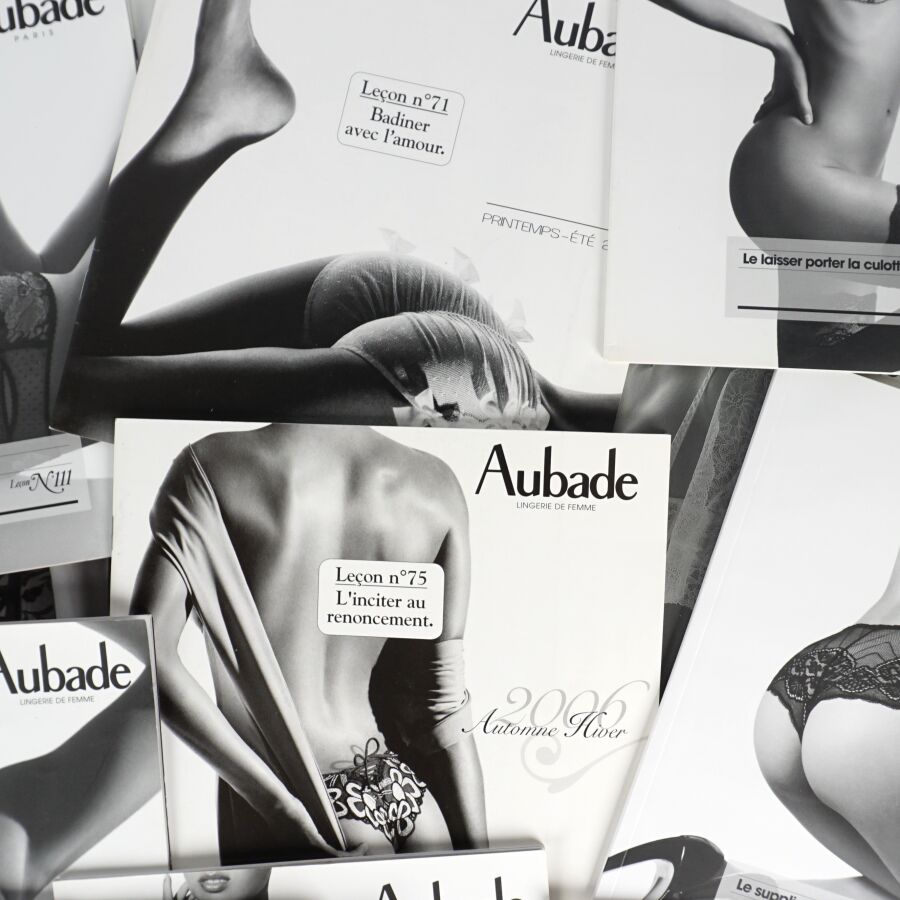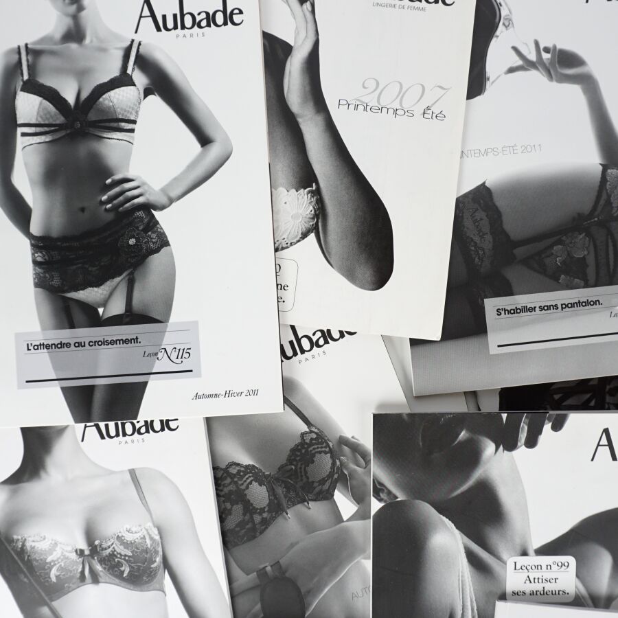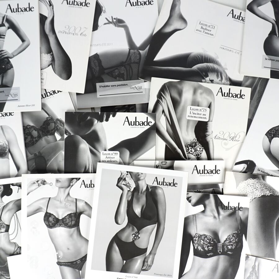 AUBADE (Lingerie). Ensemble de 37 catalogues de la célèbre maison de lingerie aux slogans mémorables (surtout accompagnées des bonnes photos…) Réunis dans un emboîtage ancien de réemploi (cassé).