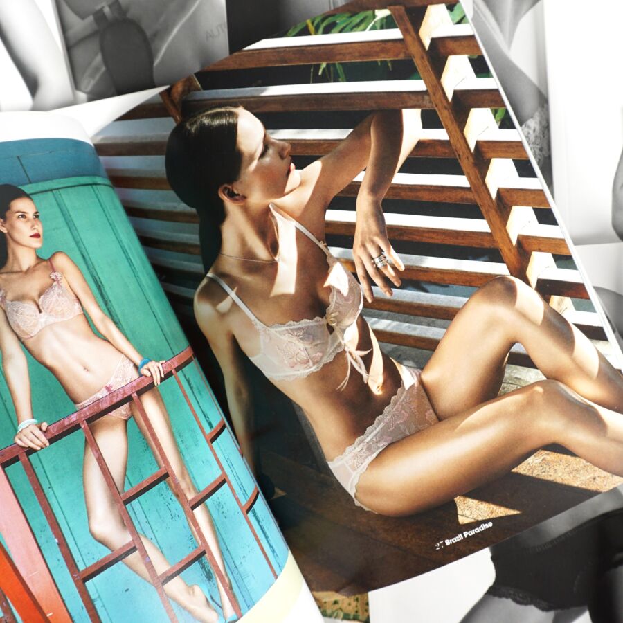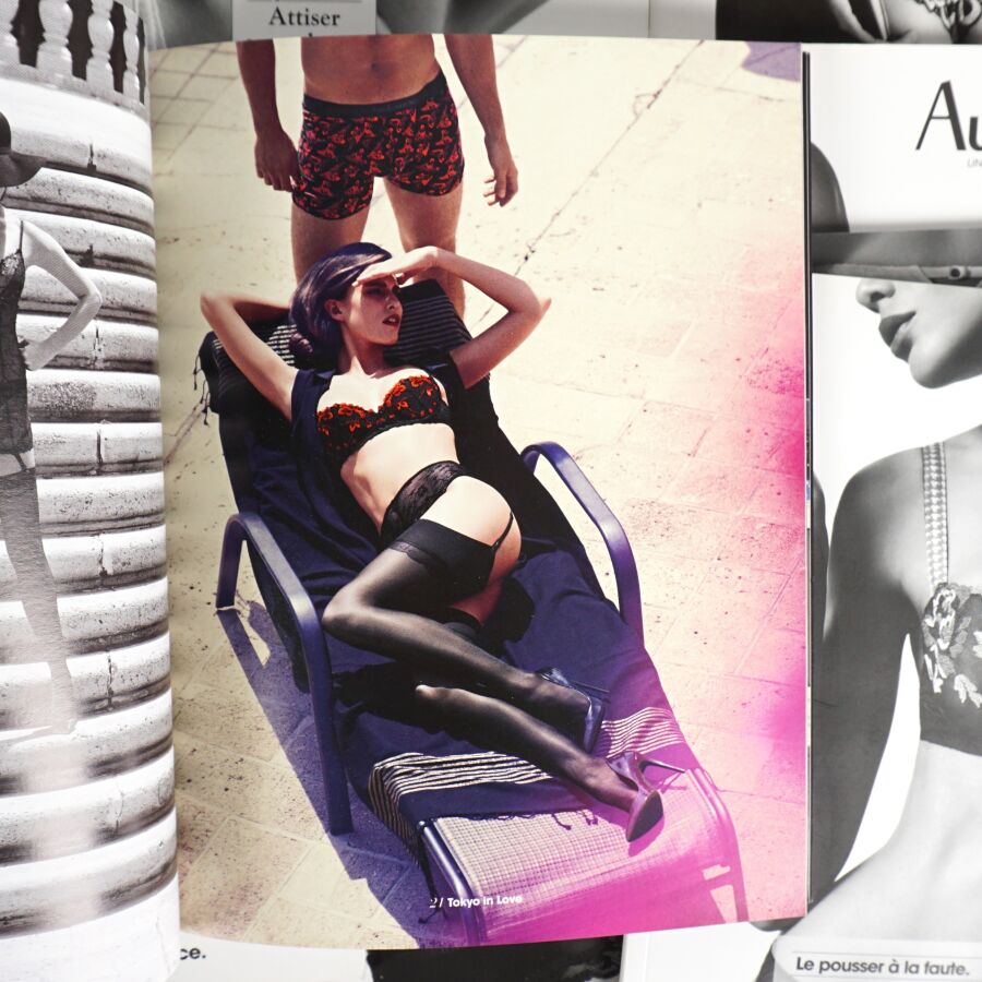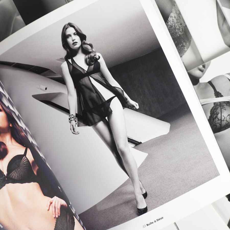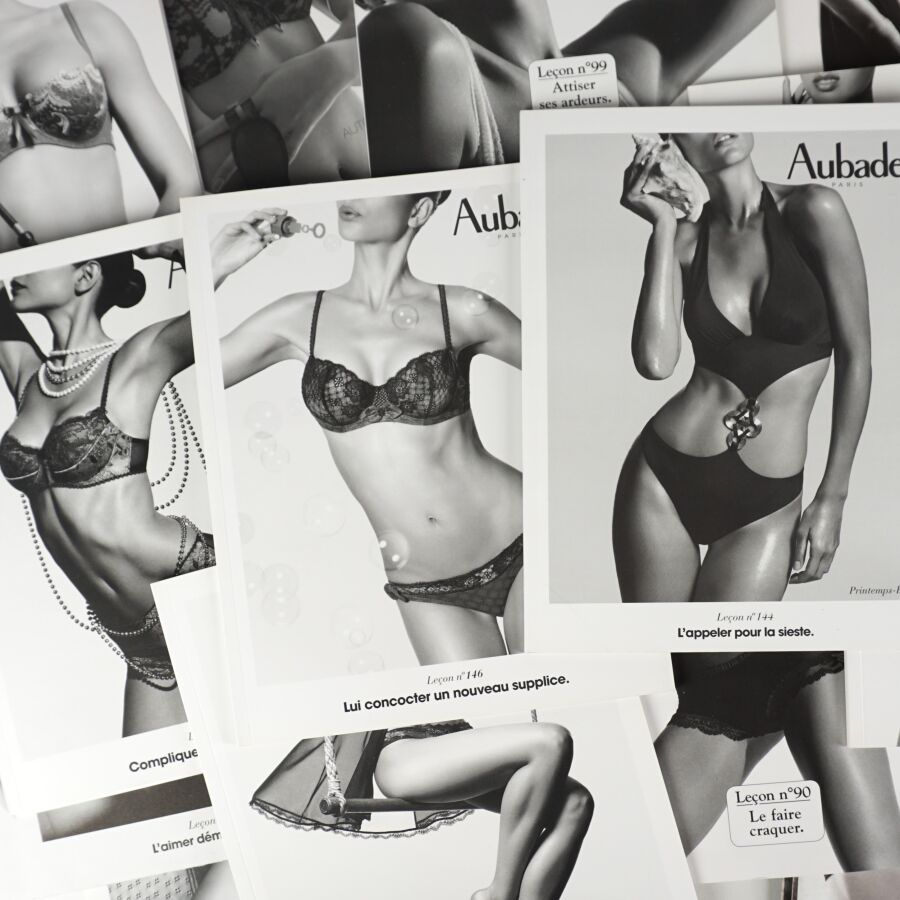 AUBADE (Lingerie). Ensemble de 37 catalogues de la célèbre maison de lingerie aux slogans mémorables (surtout accompagnées des bonnes photos…) Réunis dans un emboîtage ancien de réemploi (cassé).