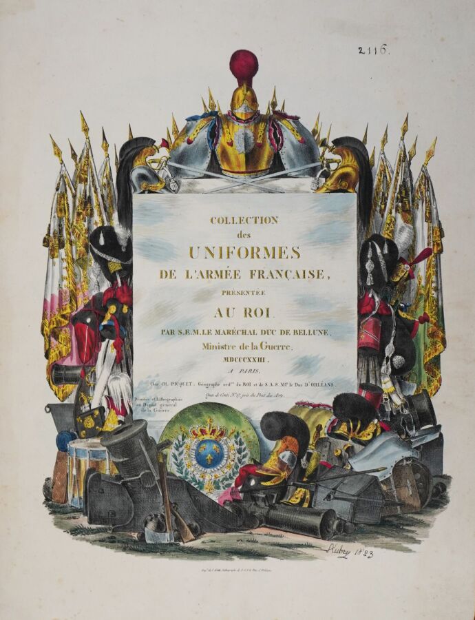 [AUBRY (Charles)]. Collection des uniformes de l'armée française présentée au roi par S.E.M. le Maréchal duc de Bellune, ministre de la Guerre. Paris, Picquet, 1823. In-folio (545 x 425 mm), 30 planches, demi-basane mouchetée à coins, dos à faux-nerfs dorés, pièces de titre rouge et noire, pièce brune avec chiffre couronné doré, chemise moderne demi-velours violet à larges rabats (reliure de l'époque).