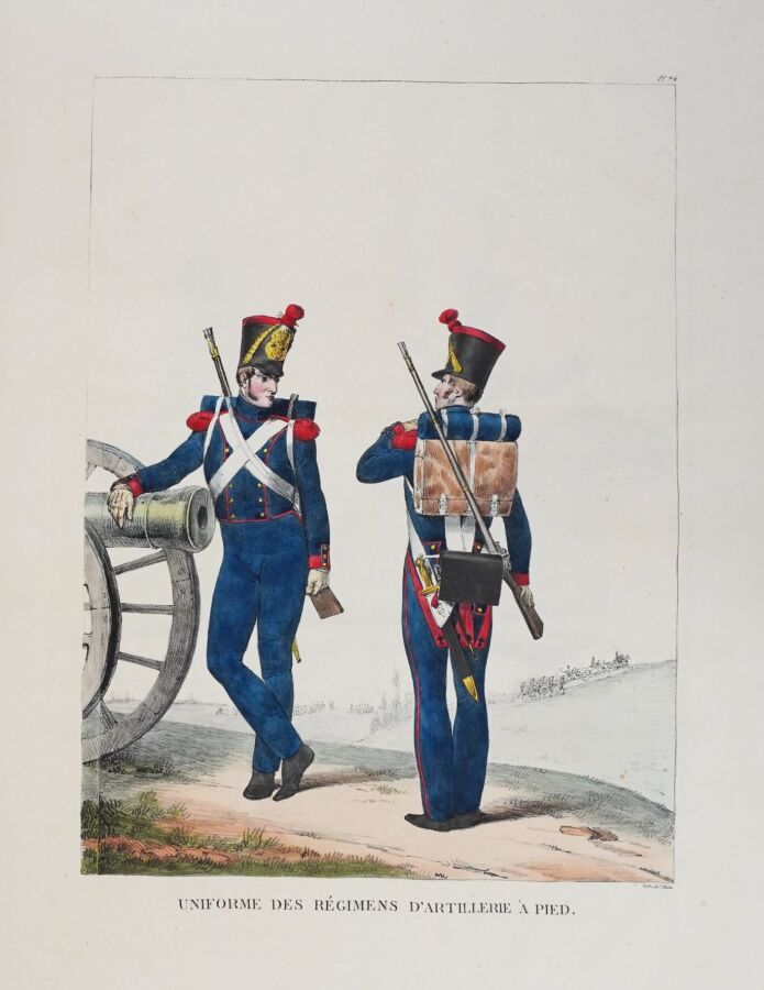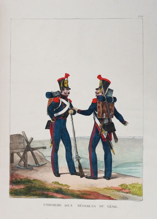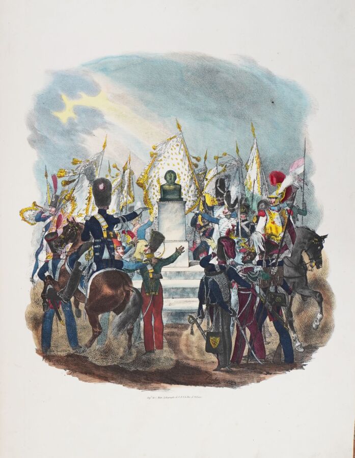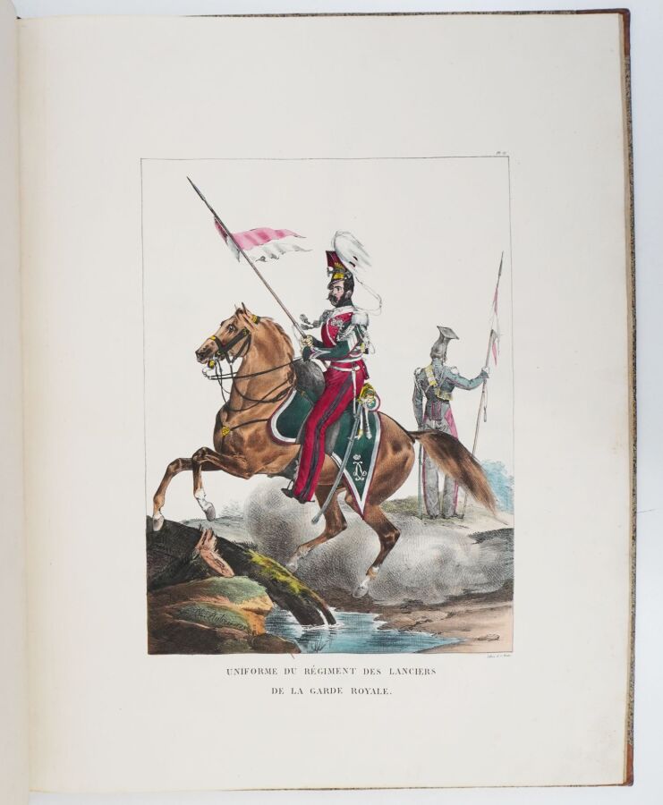 Premier tirage de cette superbe suite de 30 planches lithographiées et coloriées de costumes militaires, composée à l'occasion de l'expédition d'Espagne. Les planches ont été tirées par Charles Motte d'après les compositions de Charles Aubry. ""Cette suite bien dessinée et coloriée avec soin est extrêmement intéressante"" (Glasser).