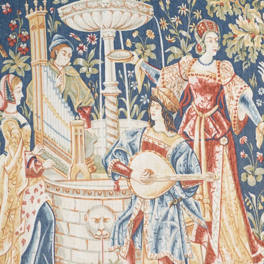 AUBUSSON - Manufacture Robert FOUR : "Concert fontaine", tapisserie imprimée en sérigraphie, numéro 622, d'après le XVIè siècle, bolduc au revers, 120 x 180 cm.