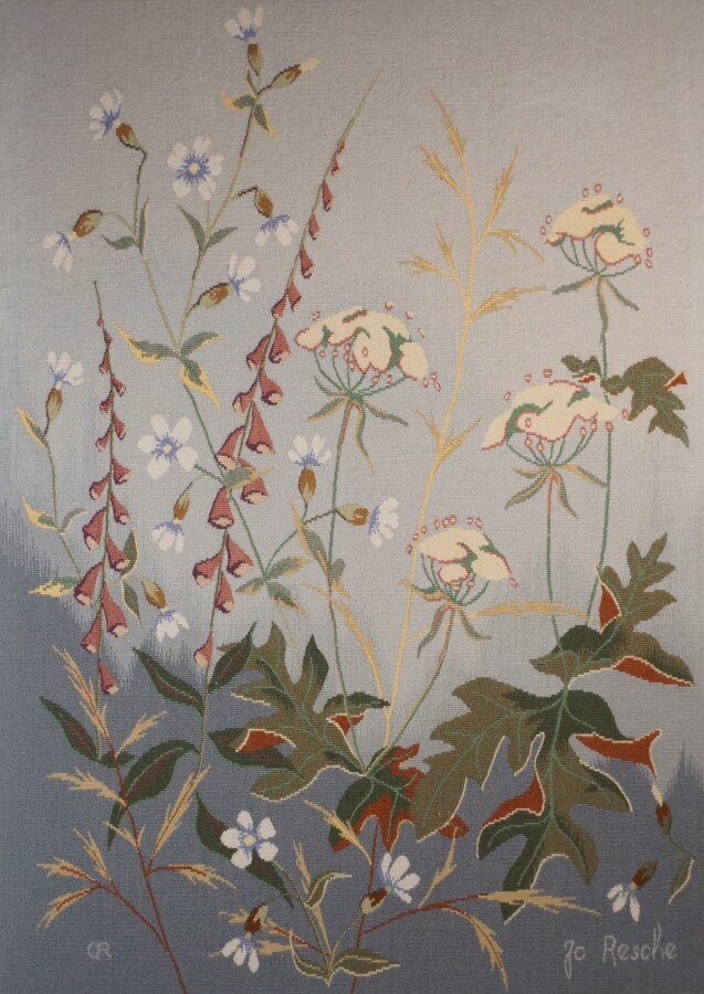 AUBUSSON : "Pastorale", tapisserie en laine polychrome d'après un carton de Jean Claude Resche, exemplaire unique, atelier Duchet René, montée sur châssis, signée, 81 x 57 cm.