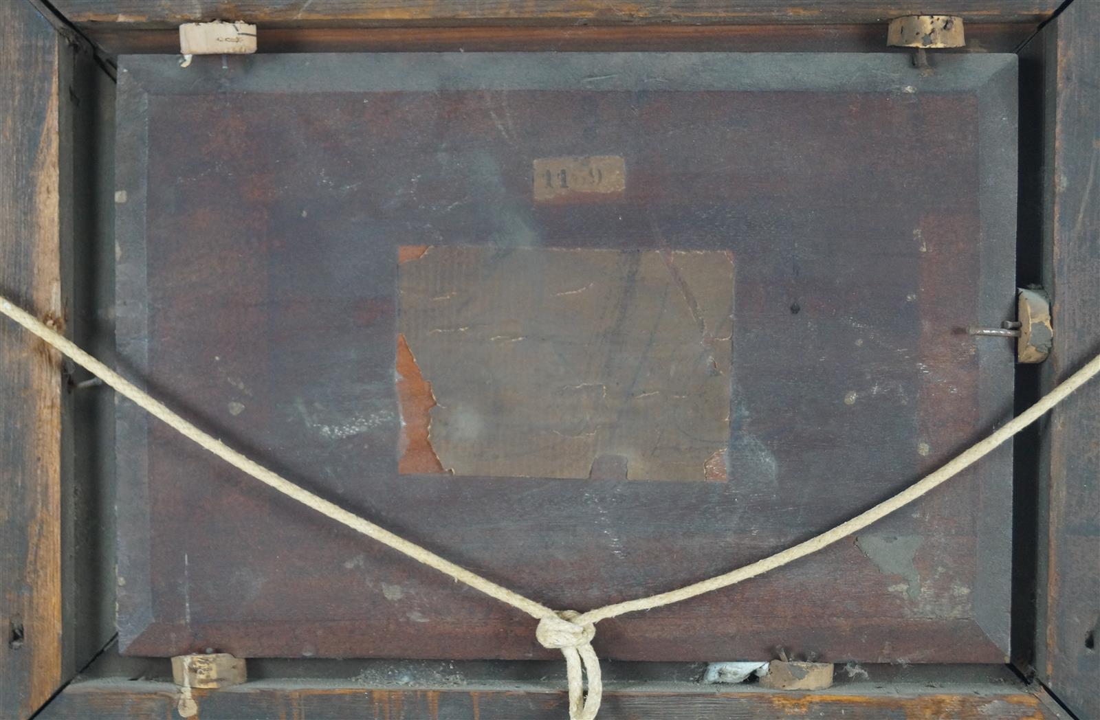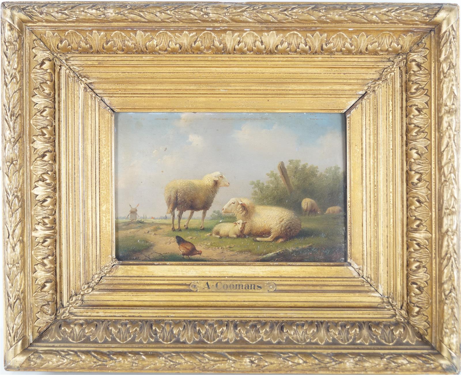 Auguste COOMANS (?-1896), "Moutons et poule", huile sur panneau biseauté, signée en bas à gauche, 17.6 x 26 cm (griffures en bordure).