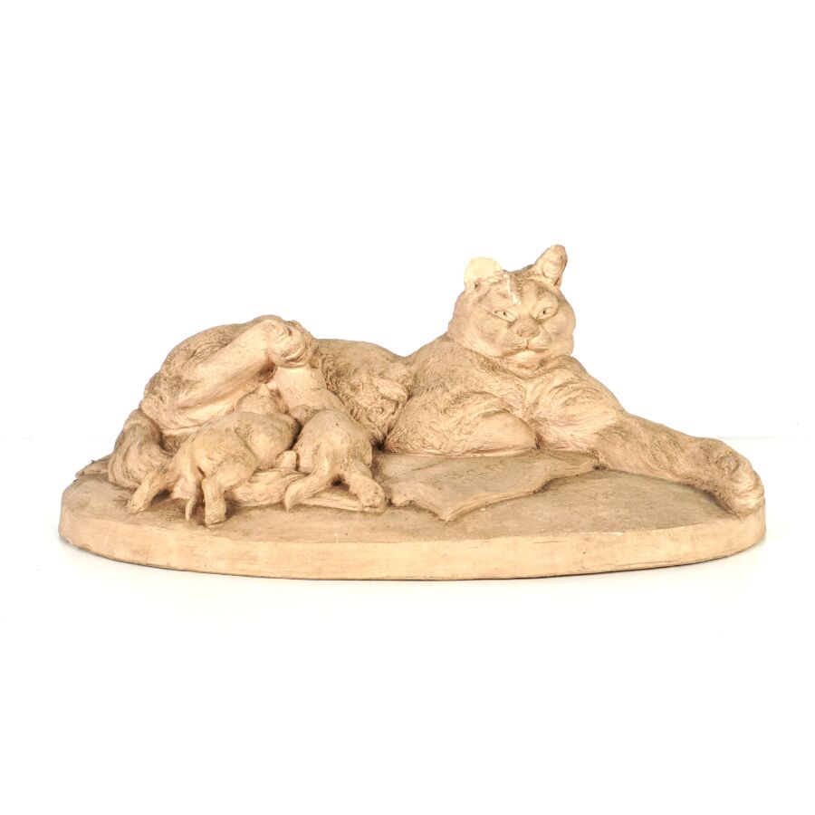 Auguste François Joseph NAYEL (1845-1909), "Chatte et ses petits" 1848, groupe en terre cuite, signé en creux sur la base, daté, porte la mention "d'après Emmanuel FREMIET (1824-1910)", H. 11 x 30.5 cm (manque une oreille, petit éclat à la seconde).