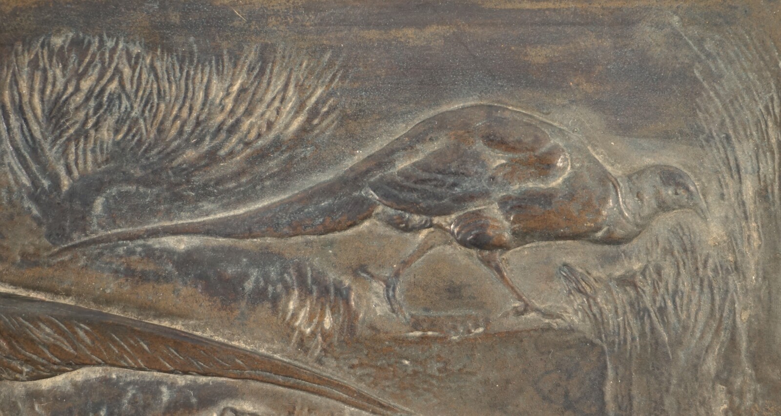 Auguste Nicolas CAIN (1821-1894), "Couple de perdrix", plaque en bronze sculpté en bas-relief, signée en bas à droite, 11.5 x 24 cm.