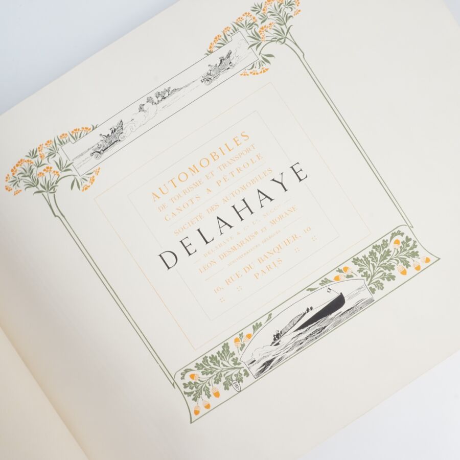 [AUTOMOBILIA] - Automobiles de tourisme et transport, canots à pétrole. Société des automobiles Delhaye - Paris ; Delahaye & Cie, Léon Desmarais et Morane, 1907 - 1 volume grand In-8° oblong broché sous couverture rempliée illustrée en relief et titrée or au 1er plat - Titre encadré et illustré en noir et en couleurs, ornementations couleurs, nombreuses vignettes in texte en photogravure, et lithographies couleurs hors texte par Abel Faivre, Léandre, Louis Morin, et Harry Eliott - Très bon exemplaire sous étui cartonné de l'éditeur.