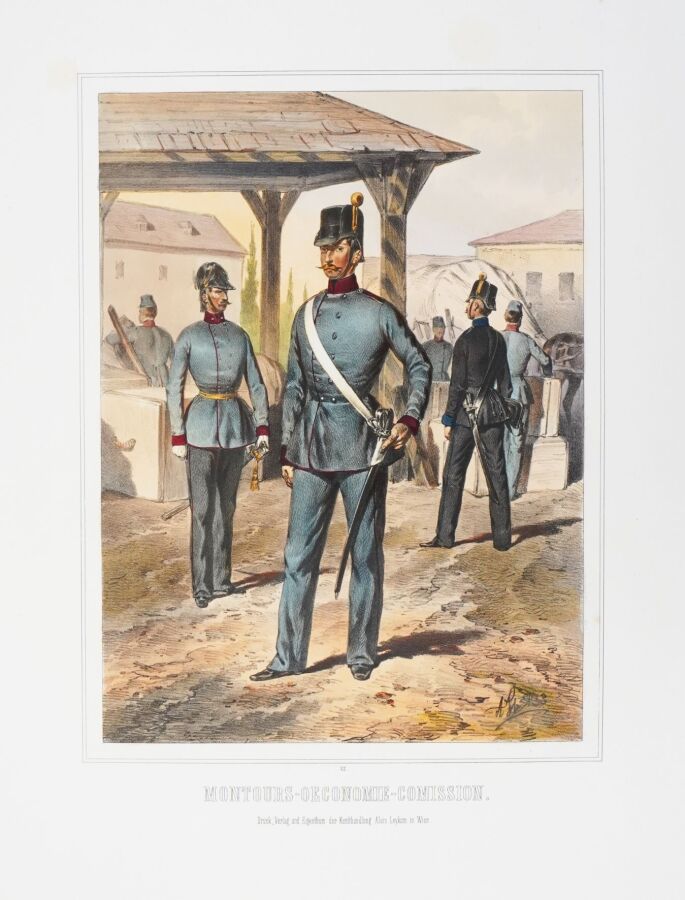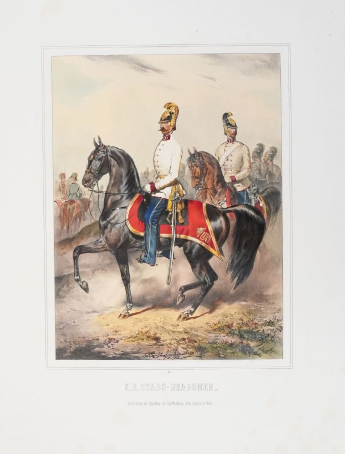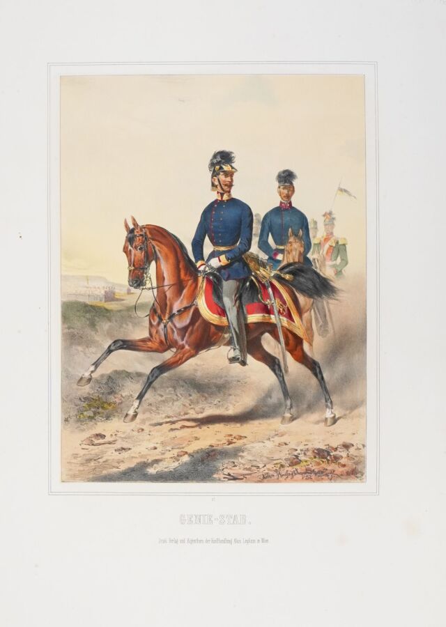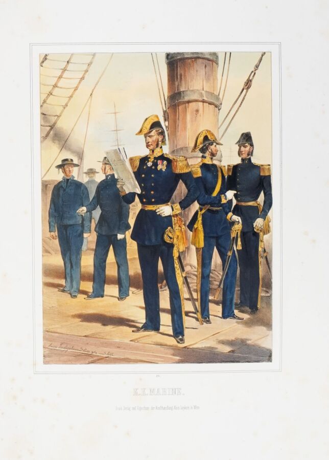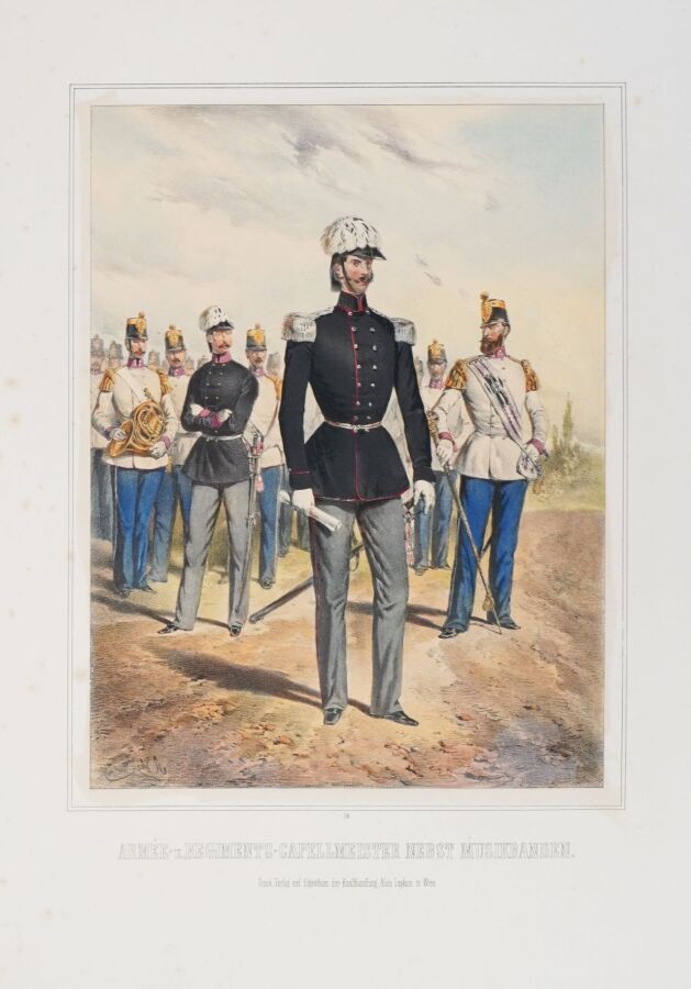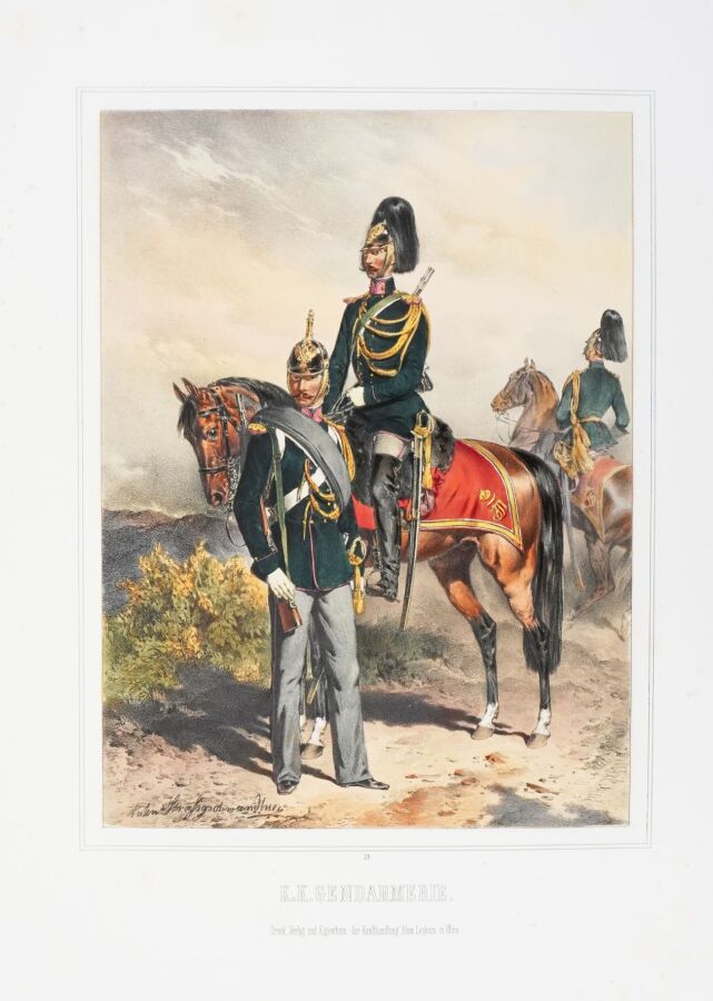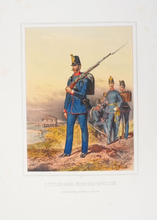 Réunion de 19 belles et monumentales planches d'uniformes autrichiens lithographiées et coloriées, dessinées par August von Pettenkofen (1822-1889) et Josef Anton Strassgschwandtner (1826-1881), peintres renommés de la double monarchie. Elles proviennent d'un rare album de costumes militaires dédié à l'empereur François-Joseph Ier, publié en 9 livraisons à 6 florins chacune. Les planches sont conservées avec 3 couvertures de livraisons et portent les numéros 17-21 et 23-36.