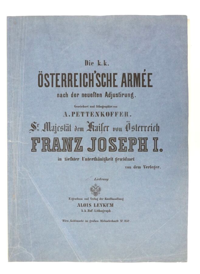 Autriche - STRASSGSCHWANDTNER (Josef Anton) & PETTENKOFEN (August von). Die k.k. Österreich'sche Armee nach der neuesten Adjustirung. Vienne, Leykum, [1850-1854]. Trois fascicules in-plano (610 x 442 mm), 19 pl. (sur 36). En ff., couv. imprimées, chemise demi-toile bleue, plats de plexiglas avec lacets de fermeture (chemise moderne).