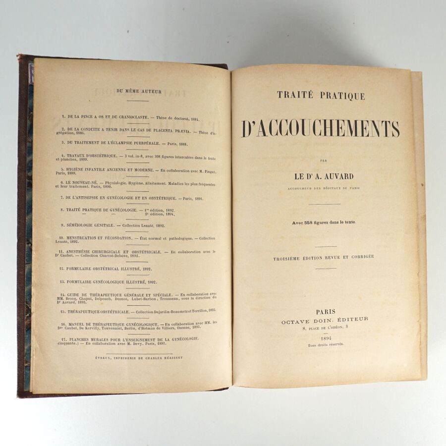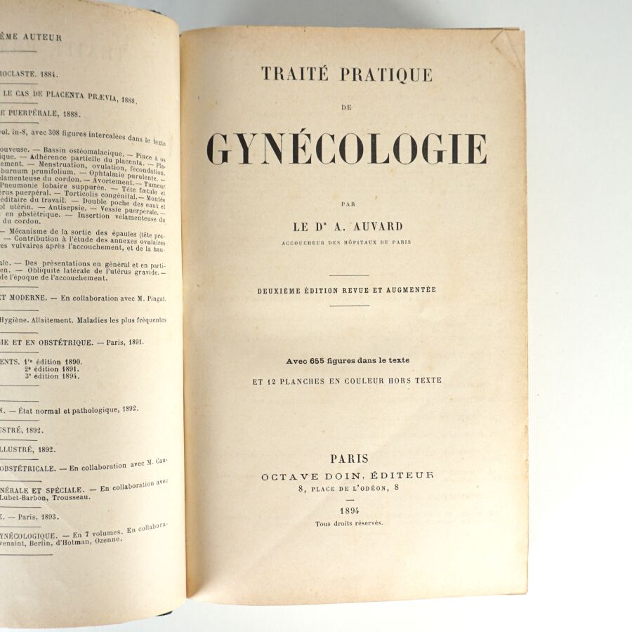 AUVARD (Dr A.). Traité pratique de gynécologie. Avec 655 figures dans le texte et 12 planches en couleurs hors texte. Paris, Octave Doin, 1894. Fort volume in-8 demi-chagrin noir, dos à nerfs, titre doré. Qqs frottés.