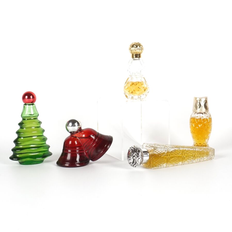 AVON : Cinq flacons, verre incolore et teinté, comprenant :
