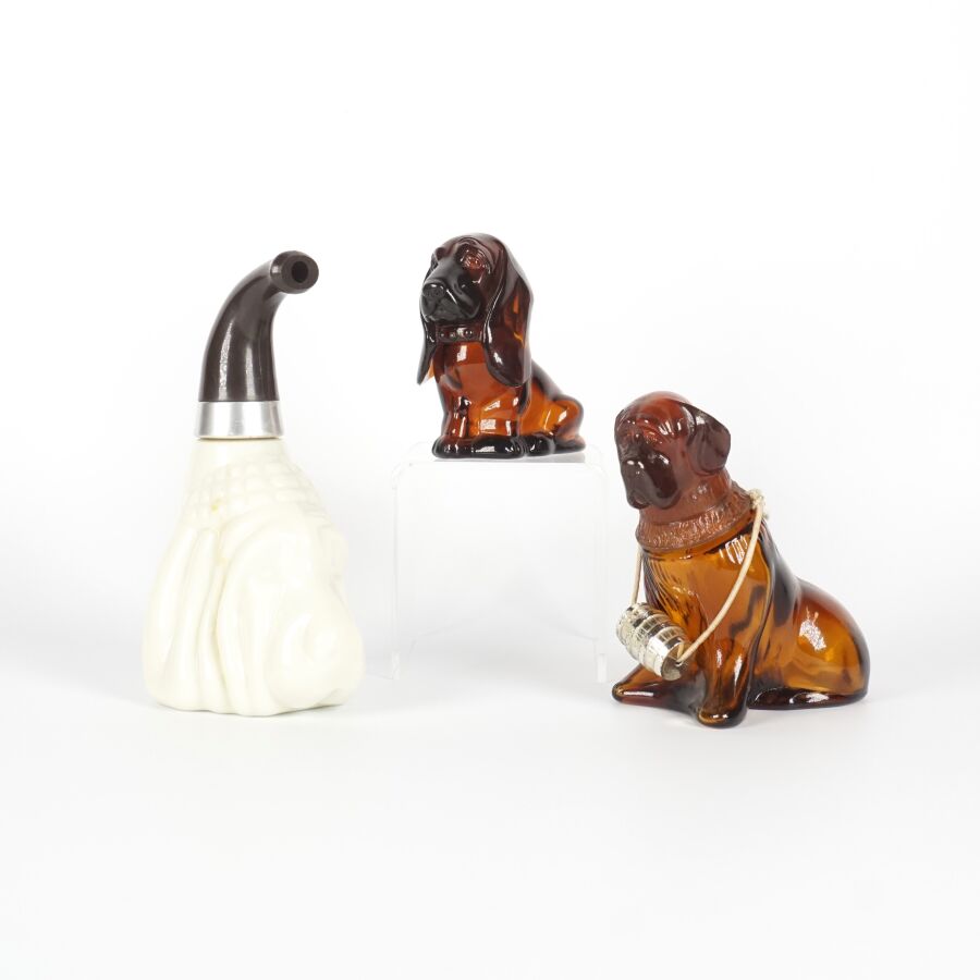 AVON : Trois flacons à motif de chiens, comprenant "Saint-Bernard assis", verre teinté brun, présenté avec son tonneau, étiquette dessous "After-Shave 100 ml", (H. 10.5 cm) ; "Basset assis", verre teinté brun (H. 8.5 cm) et flacon à motif d'une pipe, le fourneau figurant une tête de chien (H. 16 cm) (vides).