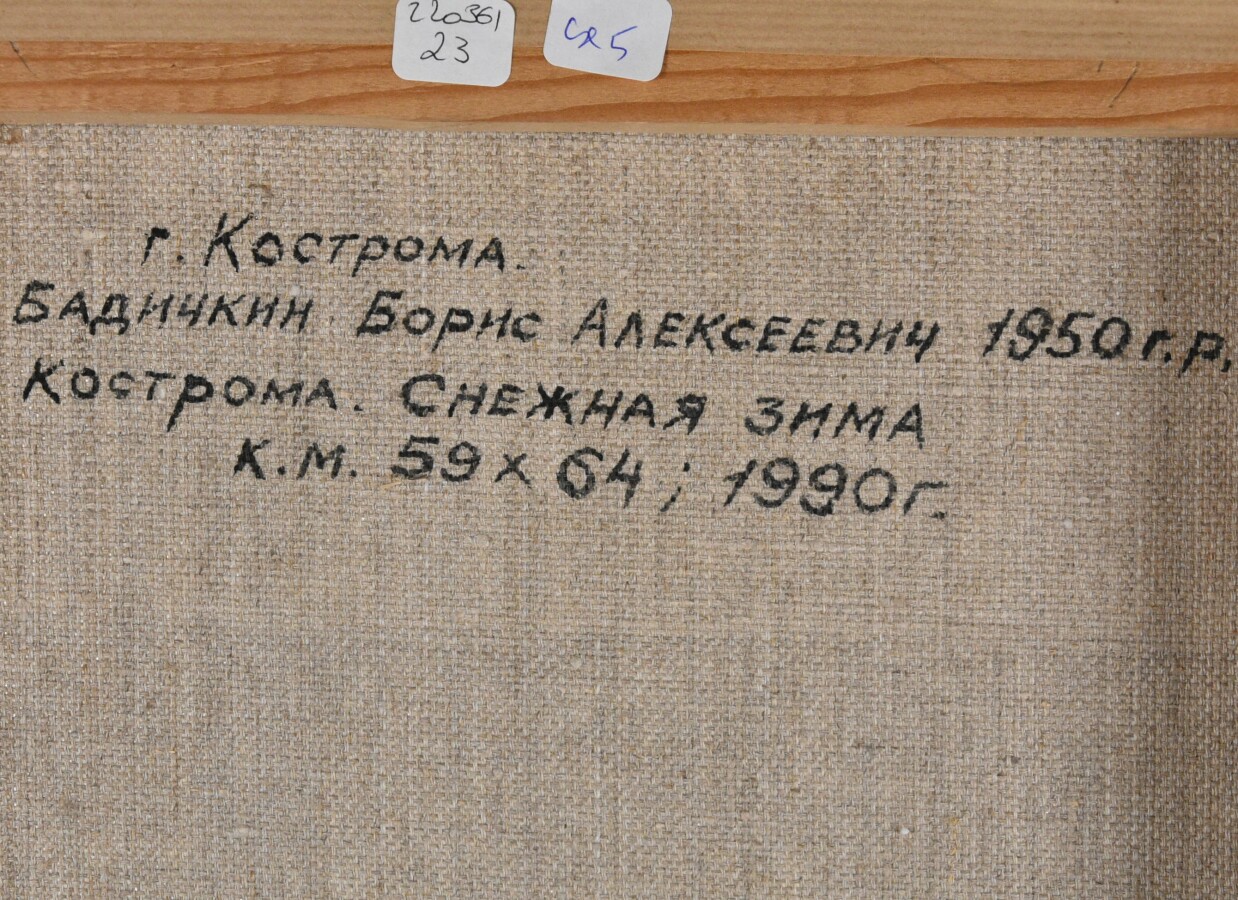 B.A. BADICHKIN (XXe), "Paysage d'hiver" 1990, huile sur toile signée en bas à droite, contresignée, située et datée au dos en cyrillique, 59 x 63 cm.