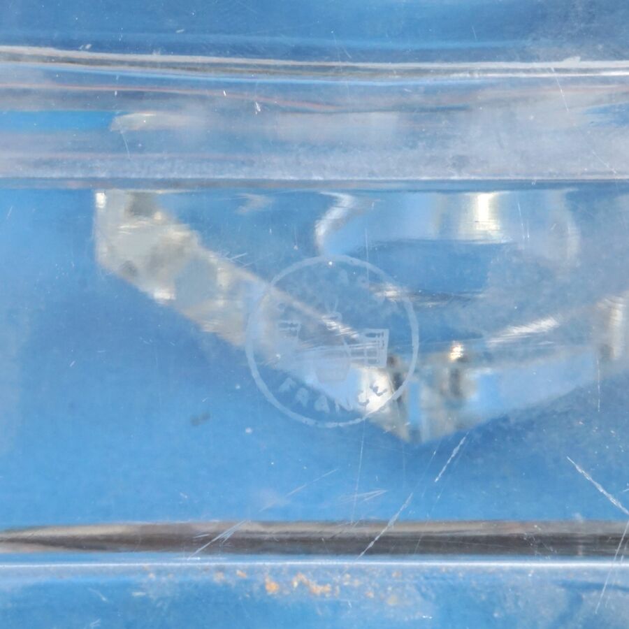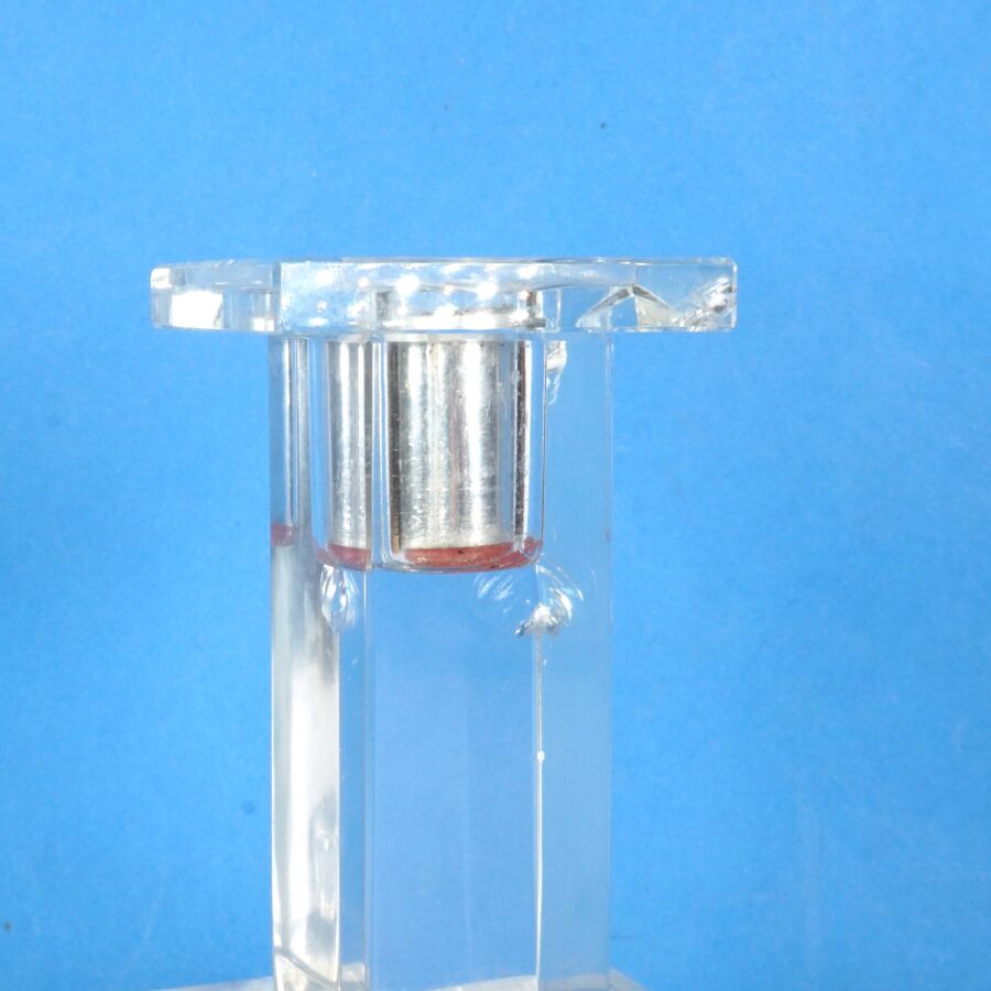 BACCARAT : Candélabre à deux bras de lumière en cristal incolore moulé, avec ses bobèches de forme carrée, signée du tampon de la Manufacture dessous, Dim.