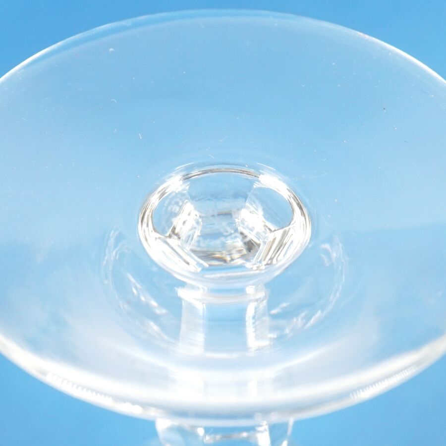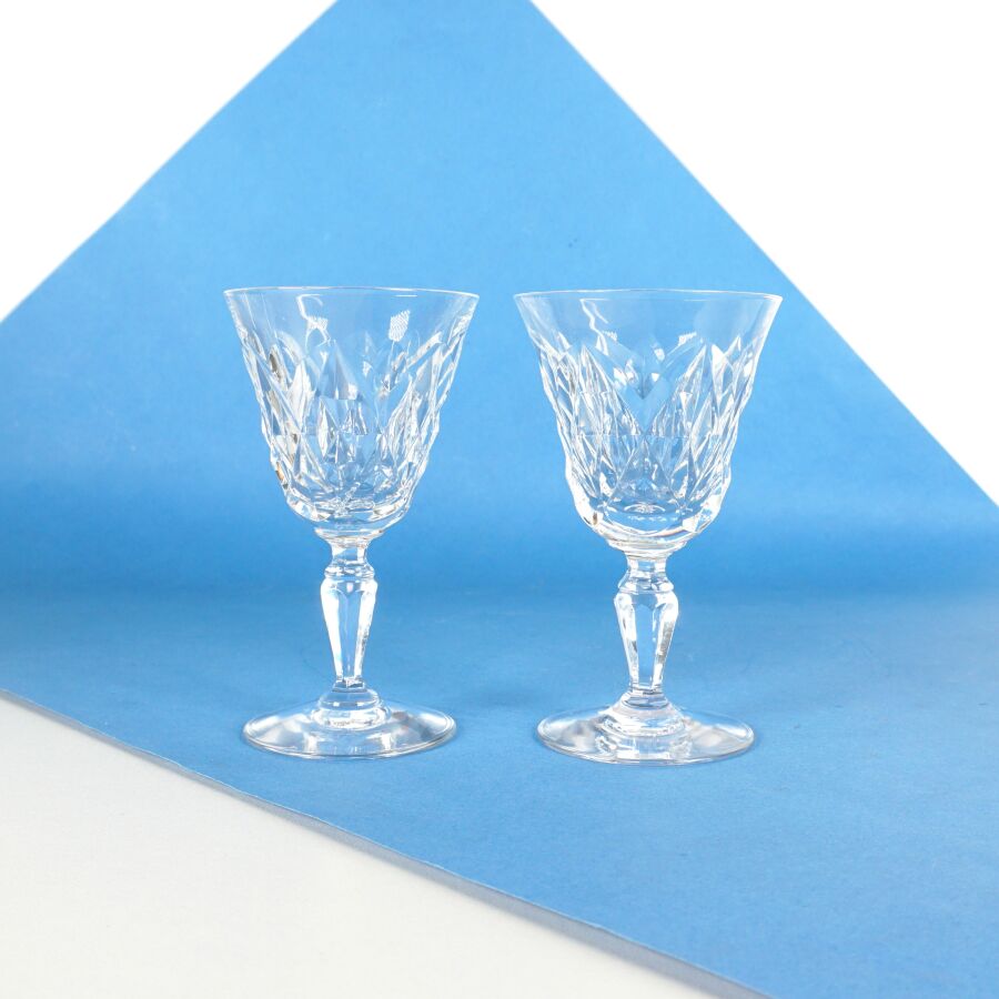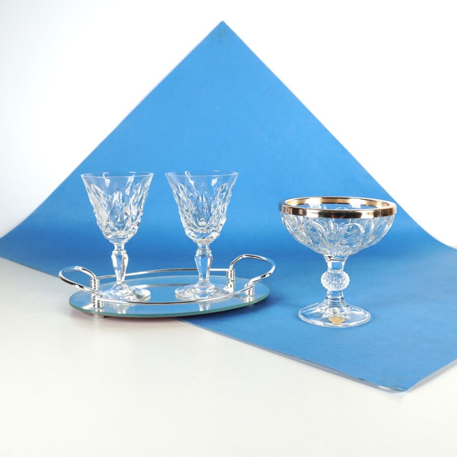 BACCARAT : Partie de service à porto "tête à tête" comprenant deux verres en cristal et un plateau en miroir, les verres signés du tampon de la Manufacture dessous, H. Verre : 12.5 cm. L. Plateau : 22.5 cm.