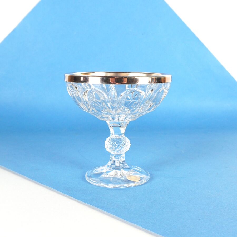 On joint une coupe sur pied en cristal taillé et virole en métal doré, portant une étiquette "VESSIERE à BACCARAT", H. 11cm.