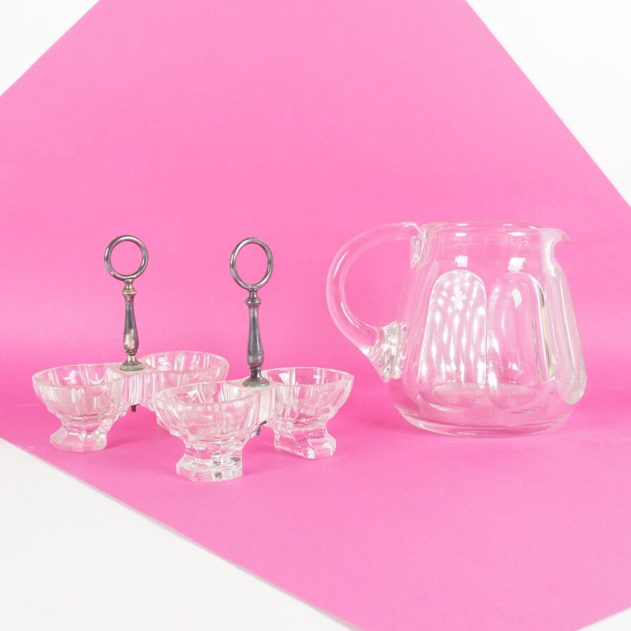 BACCARAT : Partie de service de verre en cristal comprenant 1 pichet, 1 paire de salerons doubles, 6 verres à liqueur, 1 verre à eau, 9 verres à vin rouge et 3 verres à vin blanc, H. Pichet : 13.5 cm (quelques égrenures).