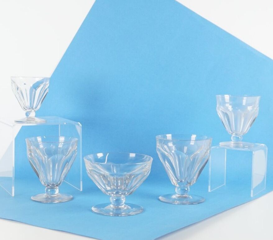 BACCARAT : Partie de service de verres en cristal, modèle "Talleyrand", comprenant 7 verres à eau, 7 verres à vin rouge, 5 coupes à champagne, 1 verre à vin blanc et 17 verres à porto, marqué dessous du tampon de la manufacture, H. 108 cm. 9.8 cm. 8 cm. 8.8 cm (deux verres meulés, éclats et fêle).
