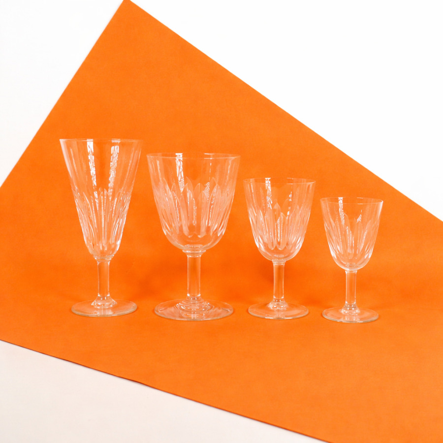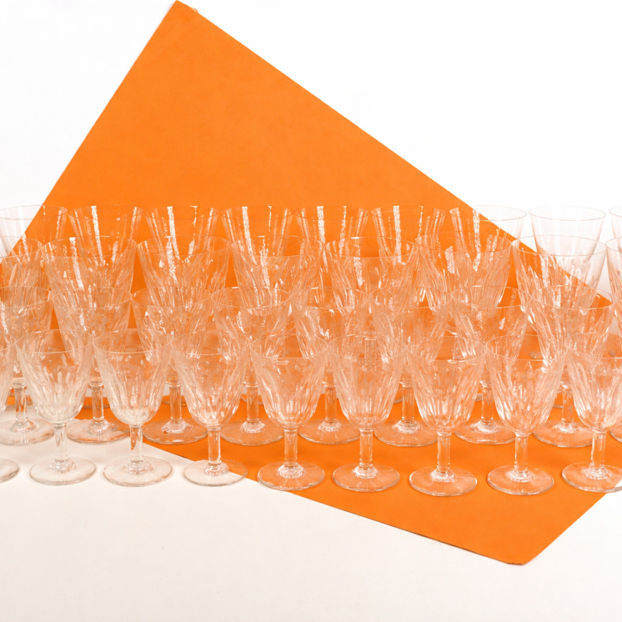 BACCARAT : Partie de service de verres, modèle "Casino", en cristal taillé à décor de lancettes comprenant 11 flûtes à champagne, 12 verres à eau, 11 verres à vin, 12 verres à porto, marqués du cachet dessous, H. Verre à eau : 14 cm. H. Verre à vin : 12 cm. H. Flûte : 16 cm.