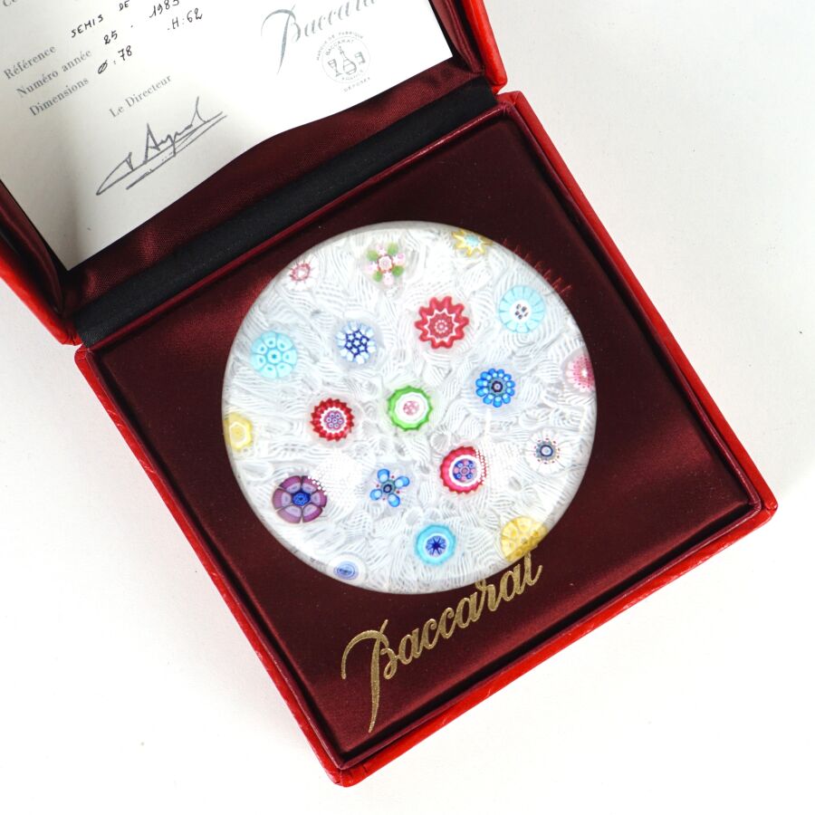 BACCARAT : Presse-papier sulfure "Semis de perles" 1983, numéroté 25 et signé du tampon de la Manufacture dessous, présenté avec son certificat et avec sa boîte d'origine, D. 7.8 cm. H. 6.2 cm.