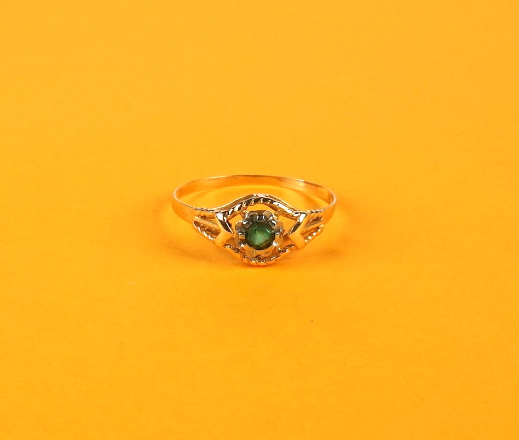 Bague ajourée en or jaune 18K (750/oo), agrémentée d'une pierre verte d'imitation (éclats et égrisures), épaulée de chevrons et de torsades. TDD 63.5. Poids brut : 1.9 g environ.