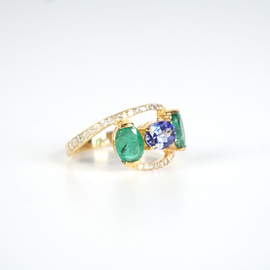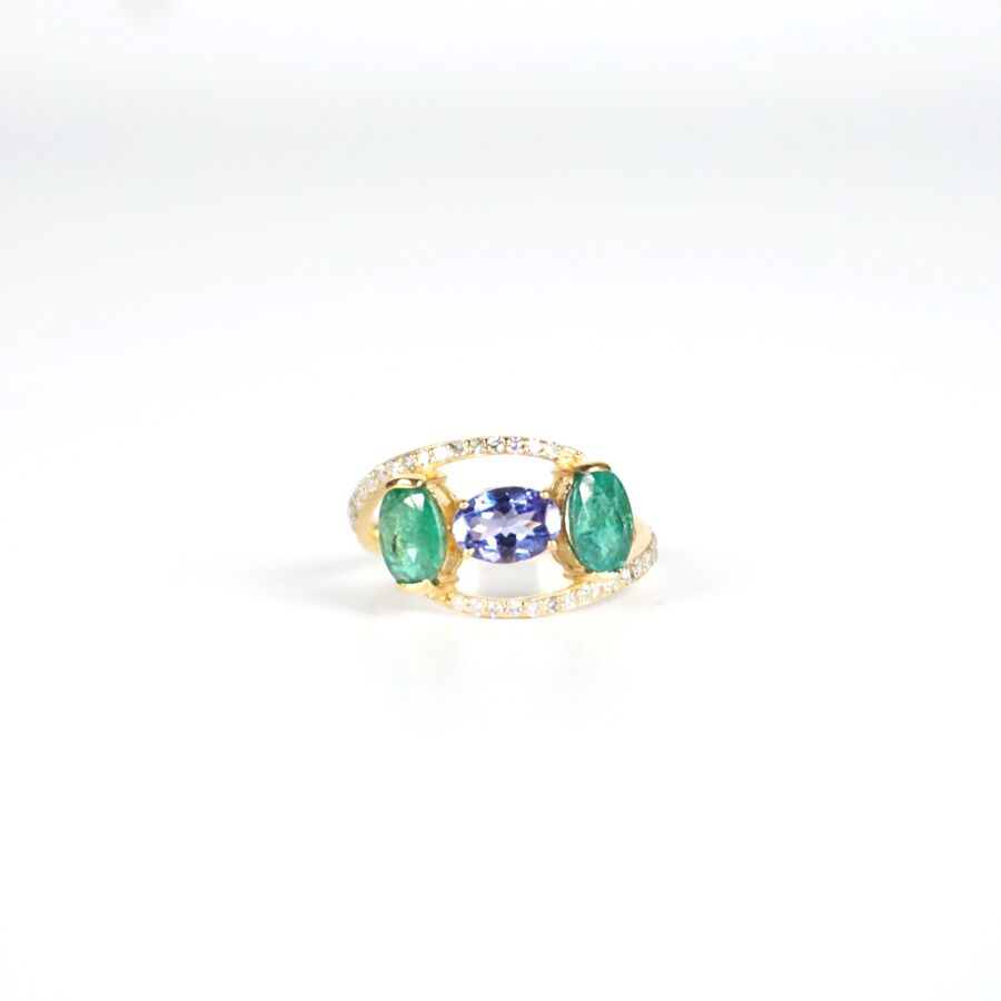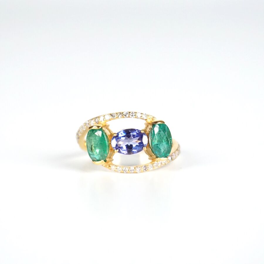 Bague ajourée en or jaune 9K (375/oo), à motif de deux lignes serties de 2x17 diamants taille brillant calibrant au total pour 0.3 cts environ, retenant au centre une tanzanite de taille ovale calibrant 0.75 cts environ (D. 7 x 5 mm) encadrée de 2 émeraudes de taille ovale calibrant au total 1.2 cts environ (D. 7 x 5 mm), TDD. 56.5. Dim. Tête de bague : 1.8 x 1.3 cm. Poids brut : 2.8 g environ (tache à l'une des émeraudes).