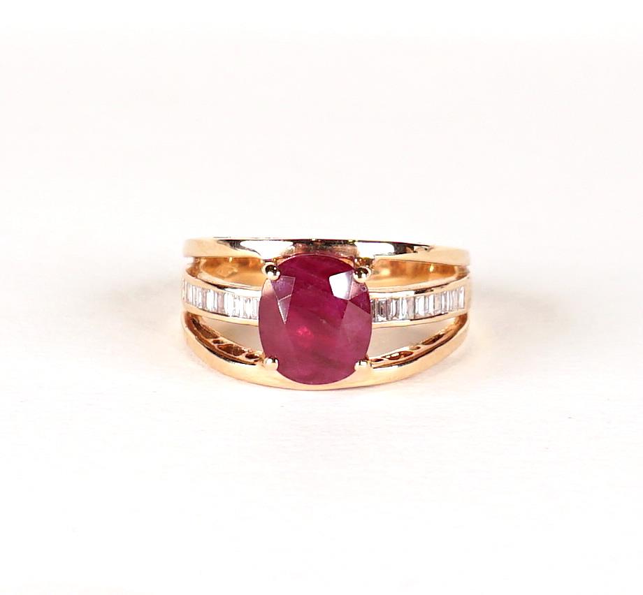 Bague ajourée en or rose 18 K (750/oo), ornée au centre d'un rubis (probablement Birman) taille ovale, 2.56 cts, épaulé de 2 lignes de 11 diamants blancs taille baguette pesant ensemble 0.15 ct. TDD 54. Poids brut : 5.25 g environ. (Certificat GGT 8020308).