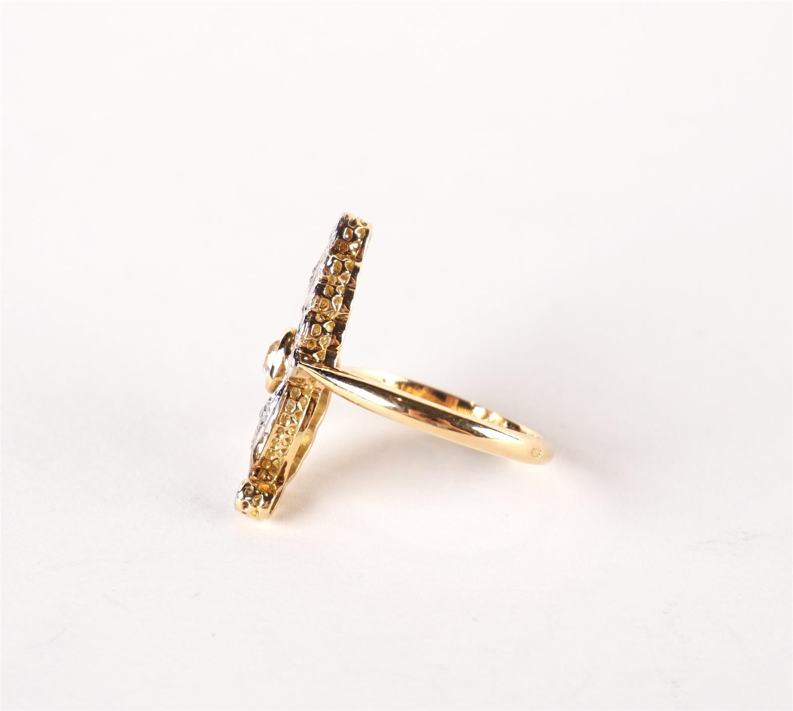 Bague ancienne en or 18K (750/oo) de deux tons à décor de volutes serties de diamants taillés en roses, au centre un diamant ovale serti clos. TDD 49. Poids brut : 2,9 g environ.