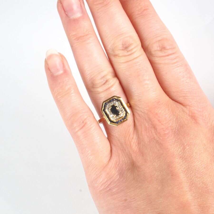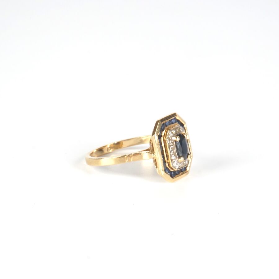 Bague Art Déco en or jaune 18K (750/oo) et platine (850/oo), plateau rectangulaire à pans coupés serti au centre d'un saphir de taille ovale, couleur bleu (D. 5.5 x 3.5 mm), dans un entourage superposé de 6 petits diamants taille ancienne et de 18 petits saphirs bleus, taille ronde, Dim. Plateau : 1.8 x 1.1 cm. TDD. 55/55.5. Poids brut : 4.6 g environ (petites usures d'usage).