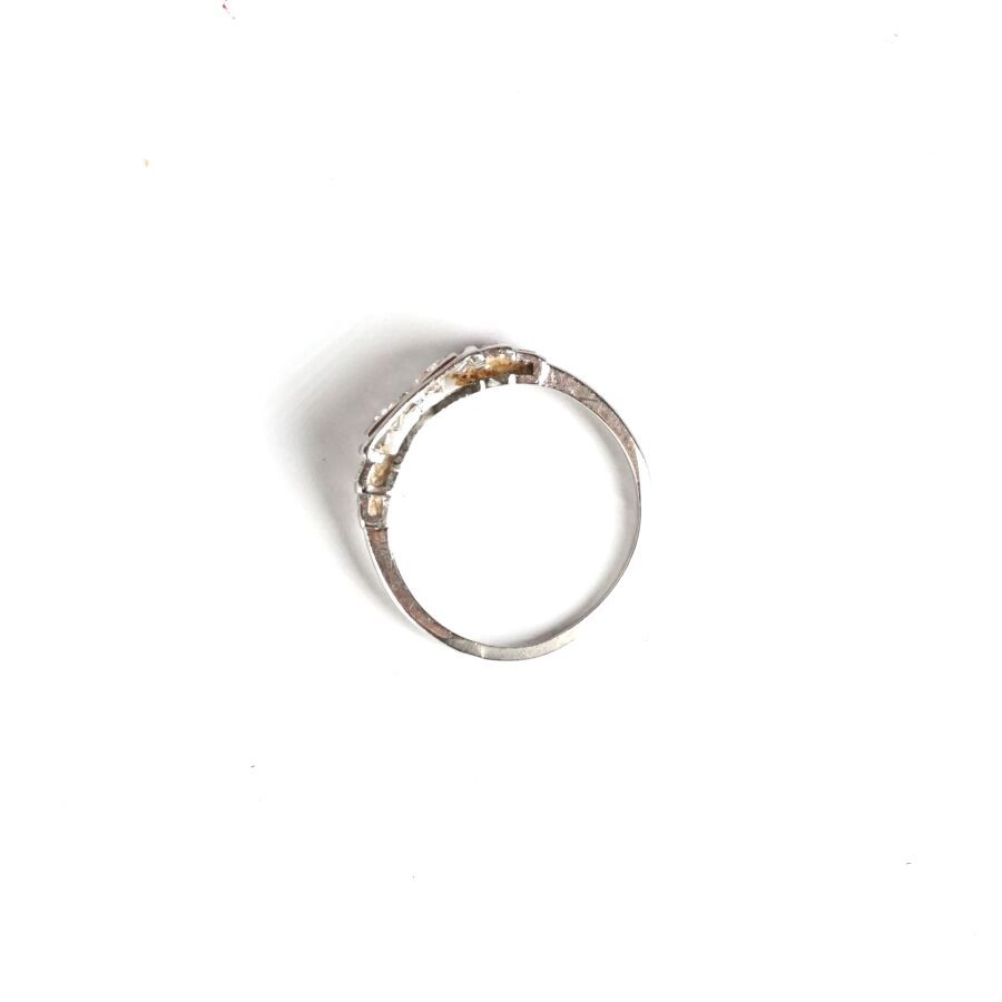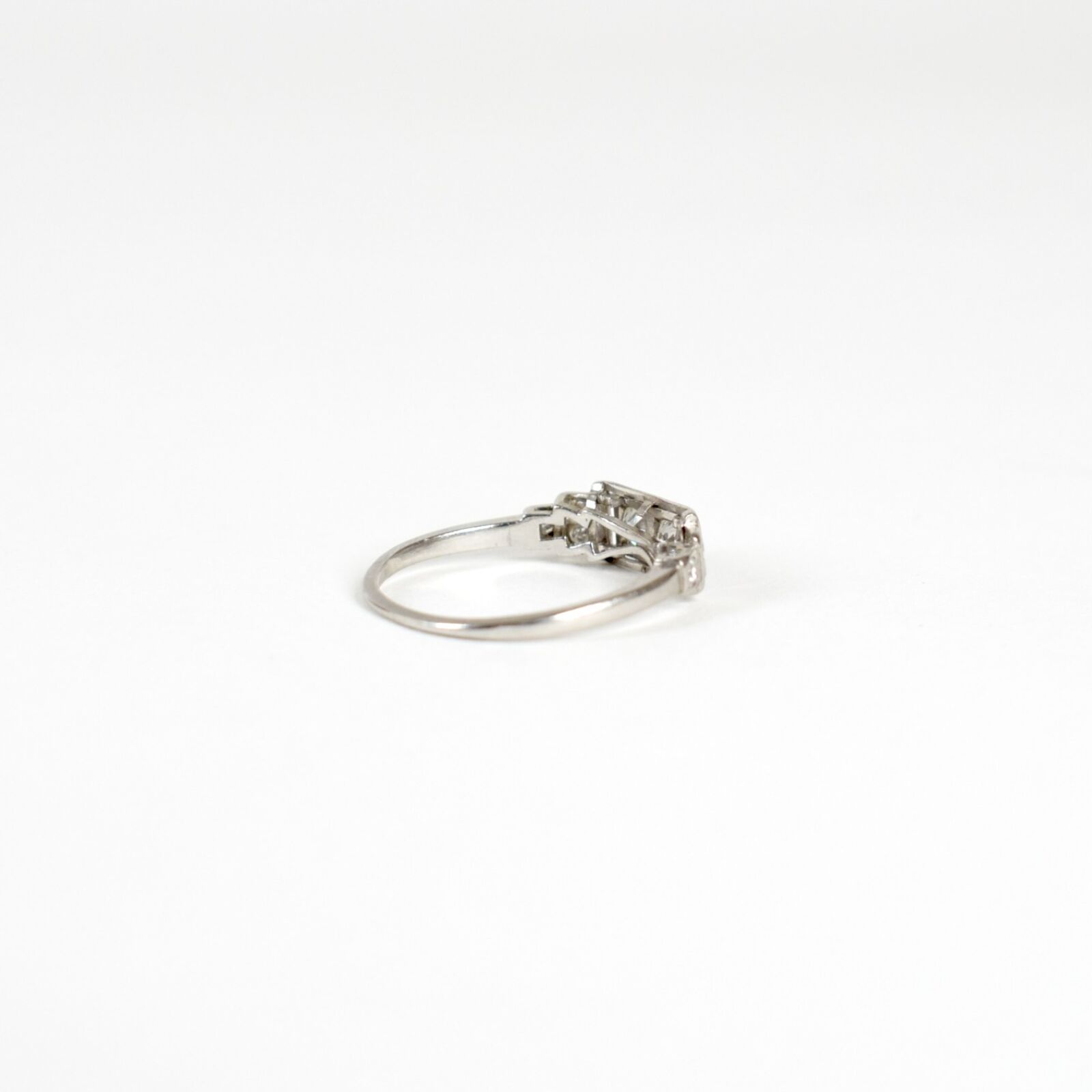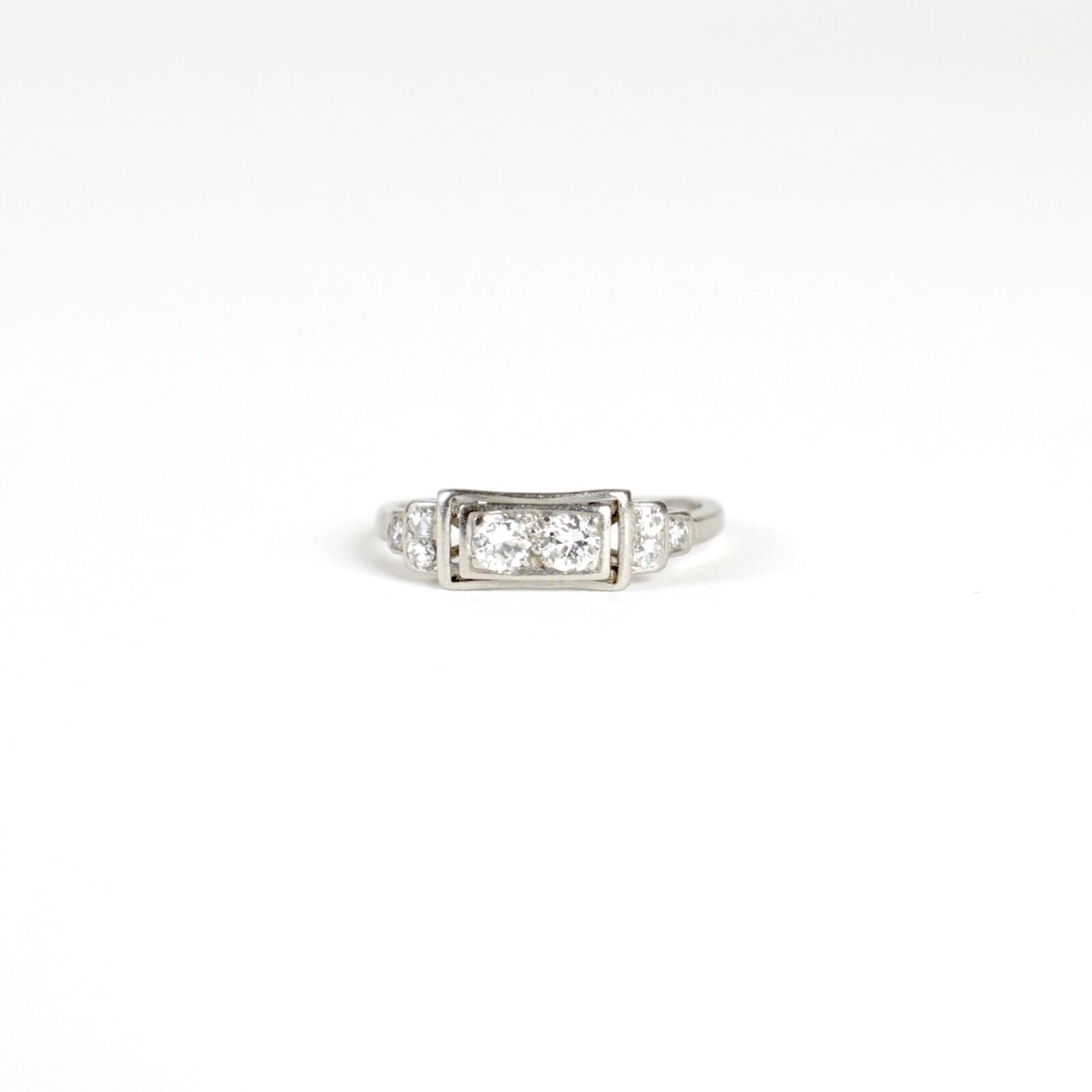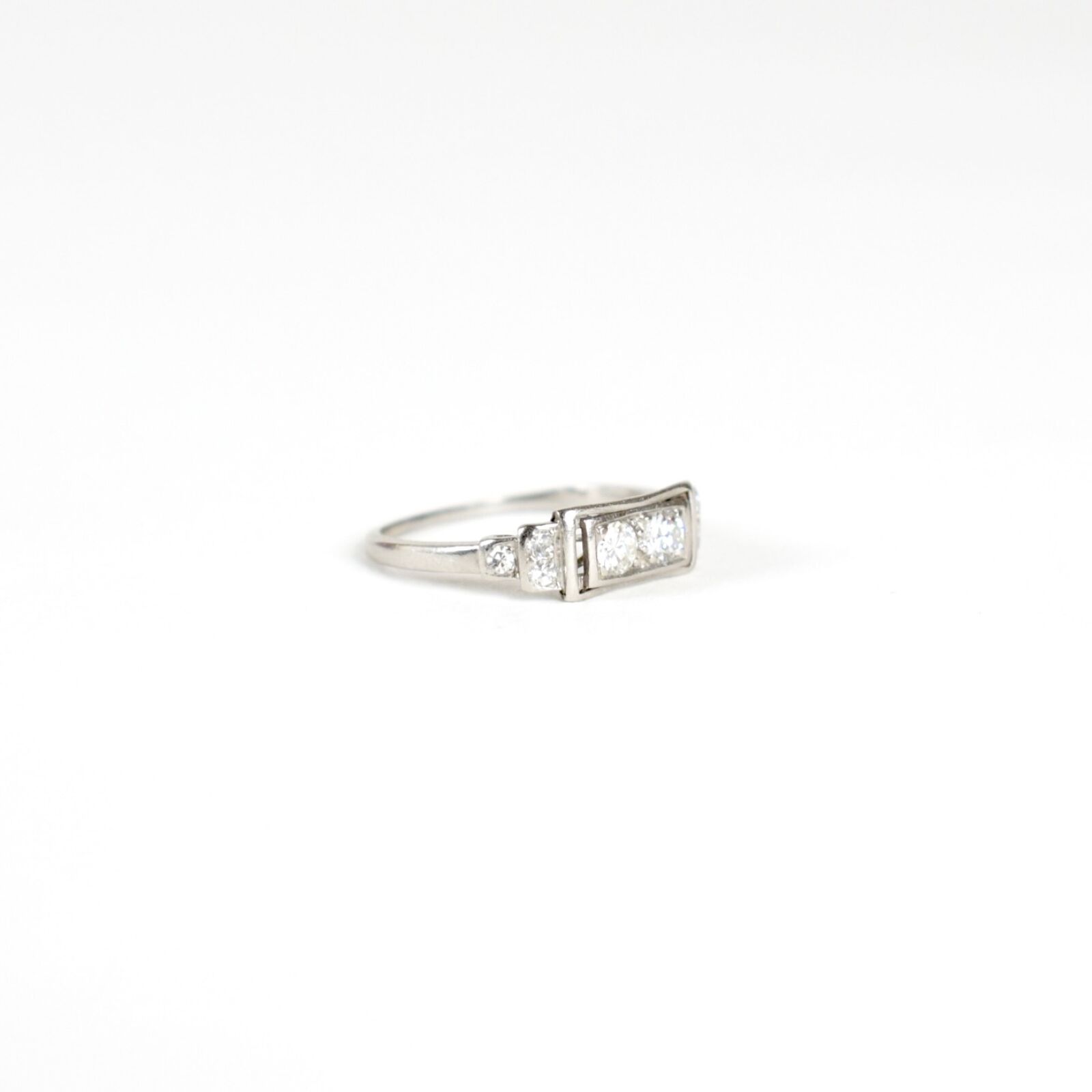 Bague Art Déco en platine (850/oo), plateau quadrangulaire serti de 2 diamants taille brillant calibrant 0.2 cts environ chaque (D. 3 mm), les montants en gradins sertis de 2x3 diamants, TDD. 52. Larg. Tête de bague : 5 mm. Poids brut : 2.5 g environ (monture inférieure accidentée).