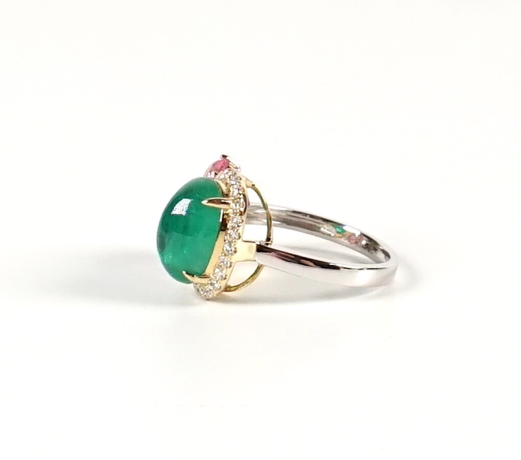 Bague "Asymétrique" en or de 2 tons 18 K (750/oo) sertie d'une émeraude taille cabochon calibrant 3.30 cts, entourée de 24 diamants blancs taille moderne pour 0.25 ct, épaulés d'un bouquet de 5 spinelles roses taille coussin pesant ensemble 1.55 ct. TDD 51.5. Poids brut : 4.4 g environ.