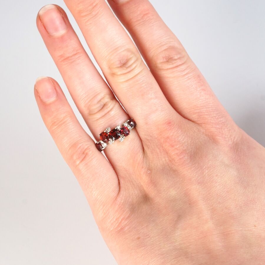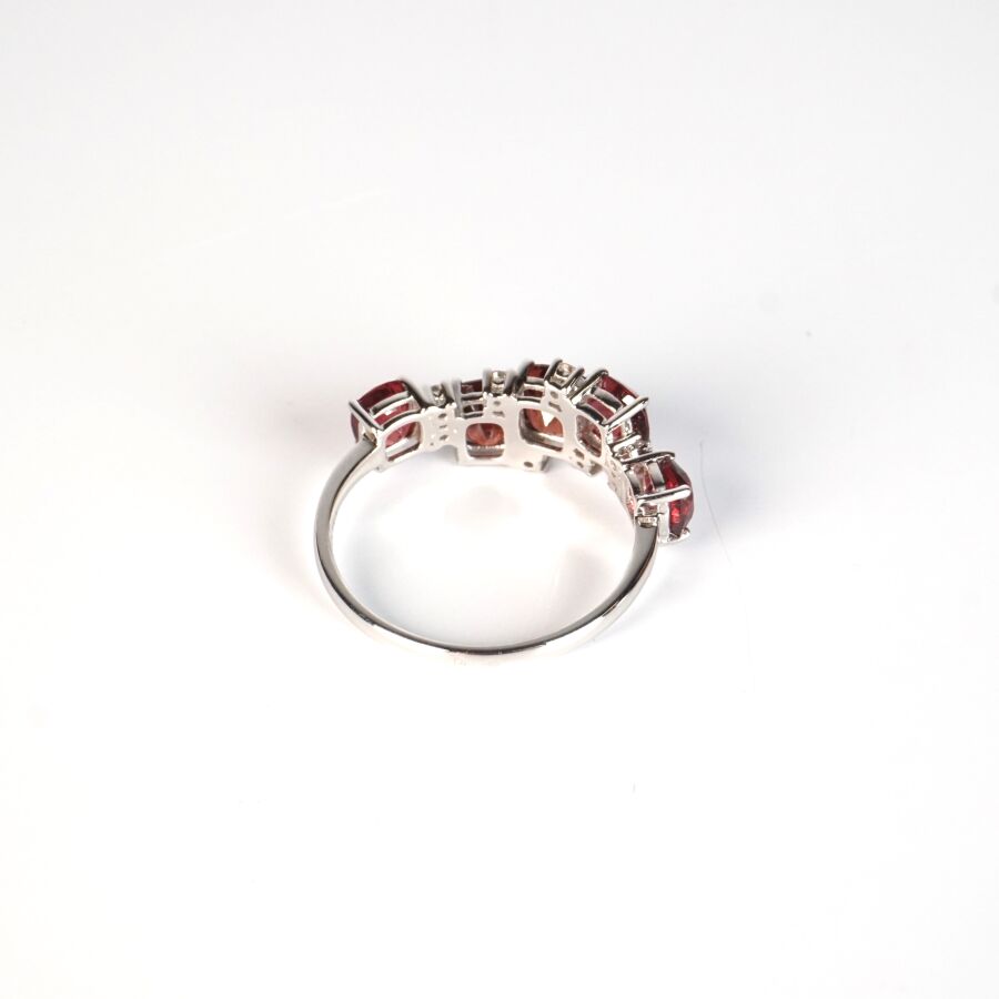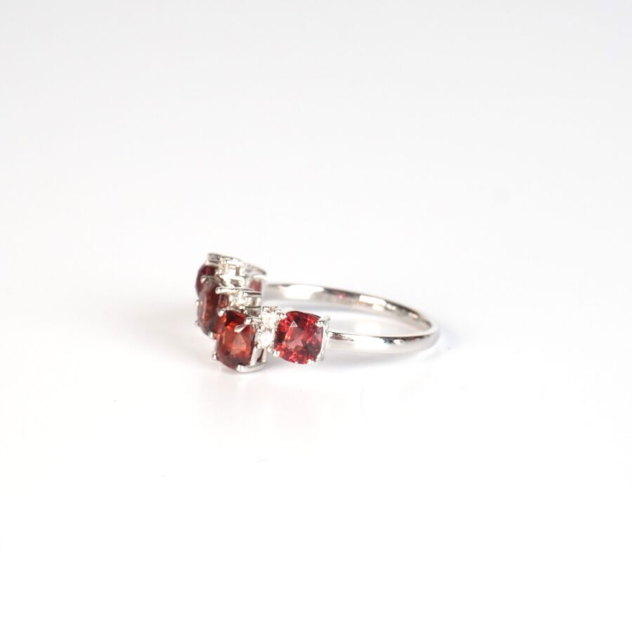 Bague asymétrique en or gris 18K (750/oo), sertie de 5 spinelles de couleur orangé et de taille coussin, calibrant ensemble 2.15 ct environ, alternées de 8 diamants blancs taille moderne calibrant au total 0.15 ct. TDD : 52. Dim. Tête de bague : 20 x 10 mm. Poids brut : 2.30 g environ.