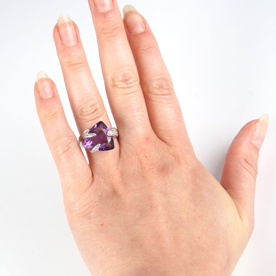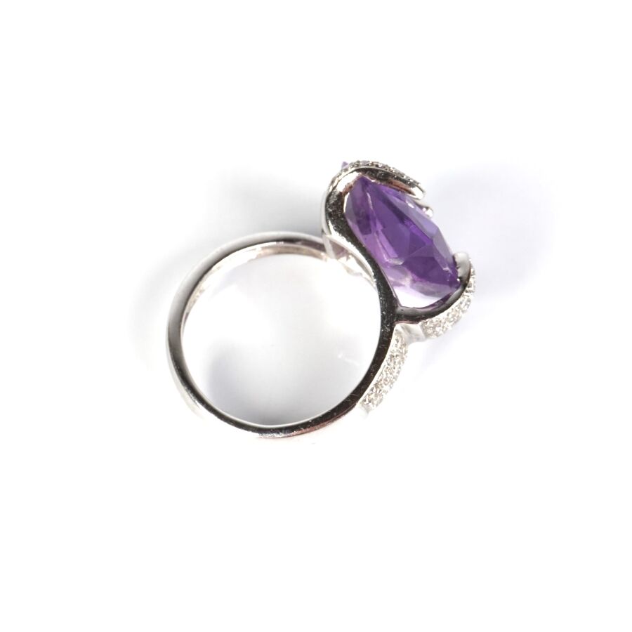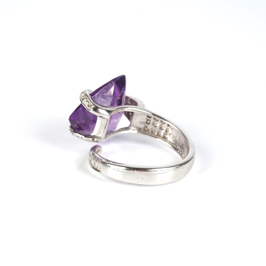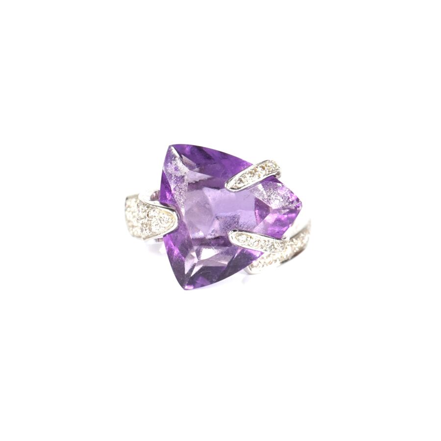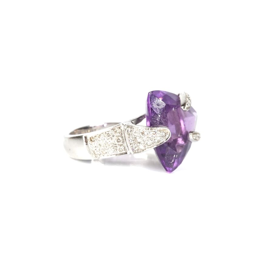 Bague asymétrique en or gris 18K (750/oo), sertie d'une importante améthyste de forme troïdale (D. 1.5 x 1.5 cm) retenue par trois lignes serties chacune de 6 petits diamants taille brillant, les montants de l'anneau sertis de 2x7 diamants, TDD. 56/56.5. Poids brut : 6.6 g environ (petite égrenure).