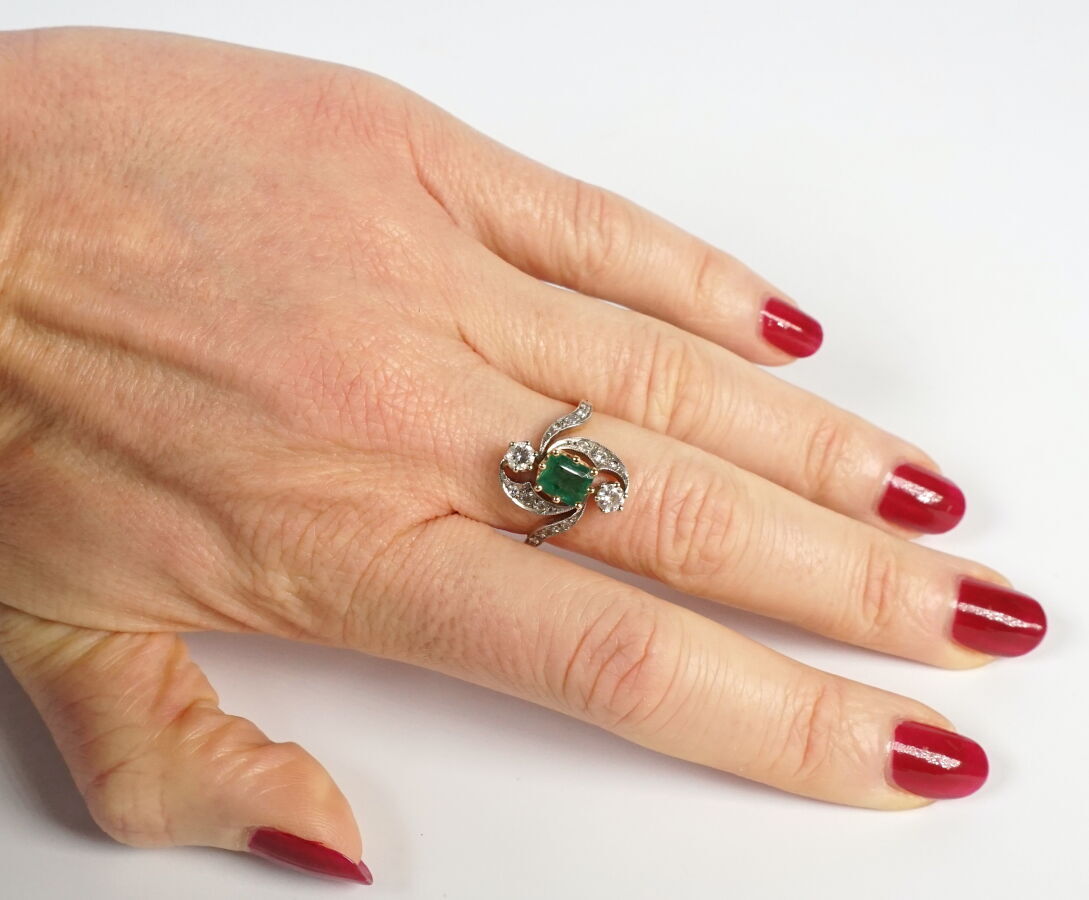Bague asymétrique en or jaune 18K (750/oo), sertie au centre d'une émeraude taille rectangulaire (7 x 5 mm), épaulée de 2 diamants ronds calibrant 0.15 carat chaque environ, dans un entourage de motifs sinueux pavés de petits diamants, Dim. du motif : 1.7 x 1.5 cm environ (petites égrisures aux pierres). TDD 58.5. Poids brut : 4.9 g environ.