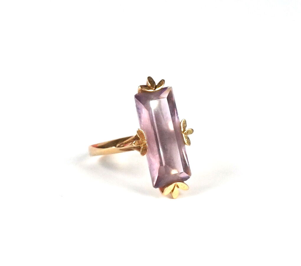 Bague "Baguette" en or jaune 18K (750/oo), sertie d'une pierre violette (17 x 8 mm), probablement une améthyste, les griffes formant des motifs feuillagés. TDD 56. Poids brut : 5.96 g environ.