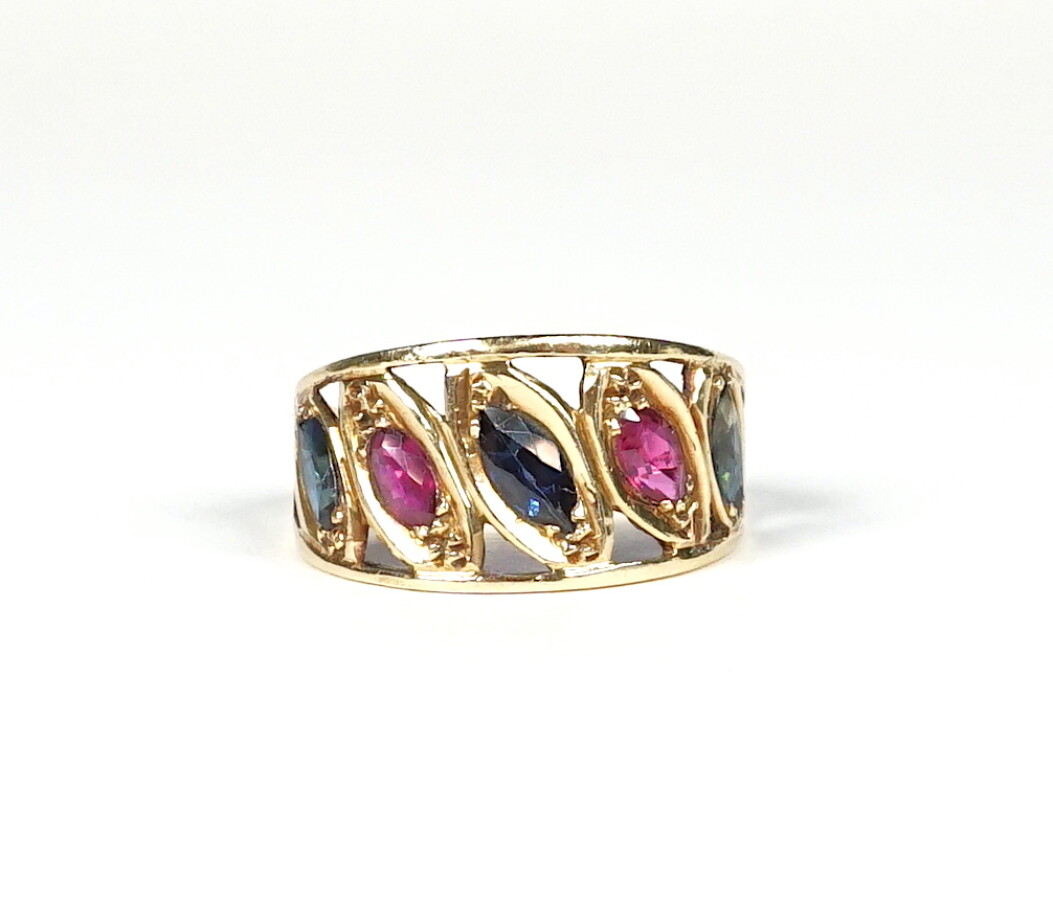 Bague "Bandeau" ajourée en or jaune 18K (750/oo) ornée de 5 navettes serties de 2 rubis rose alternés de 3 saphirs. TDD 53. Poids brut : 4.1 g environ.