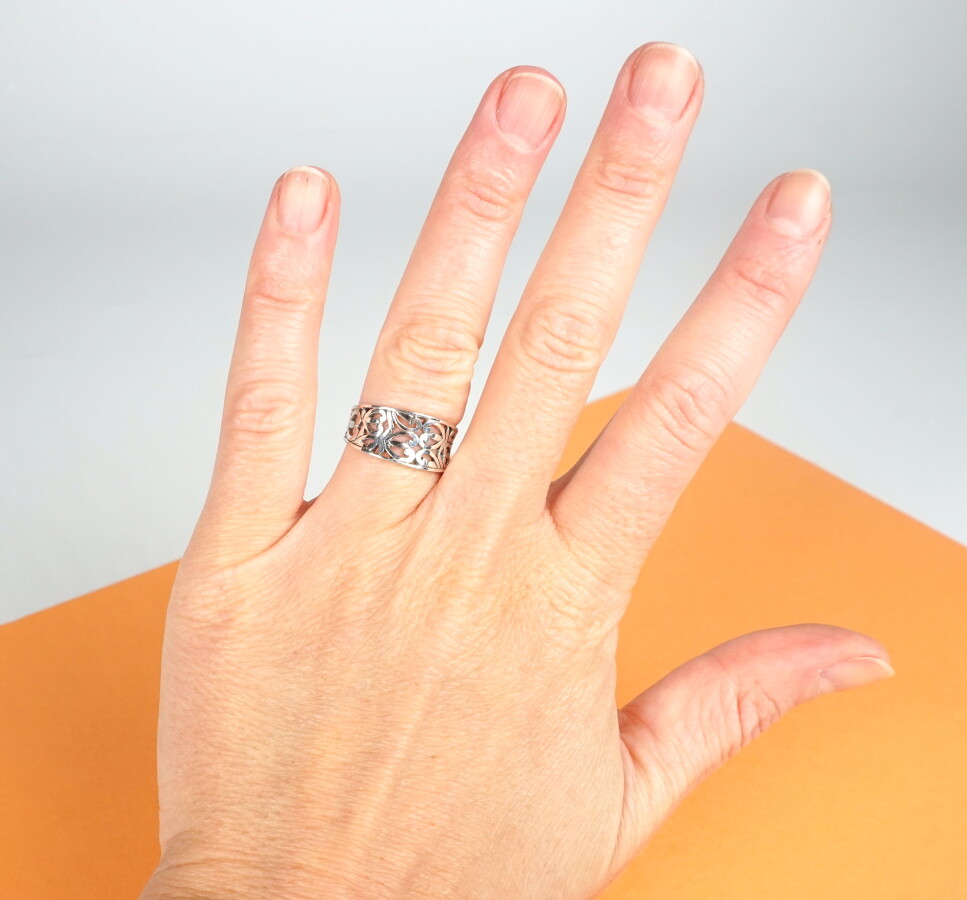 Bague "Bandeau" en argent (925/oo) à motifs ajourés de rinceaux, Lar. 1 cm. TDD 55. Poids brut : 2.6 g environ.