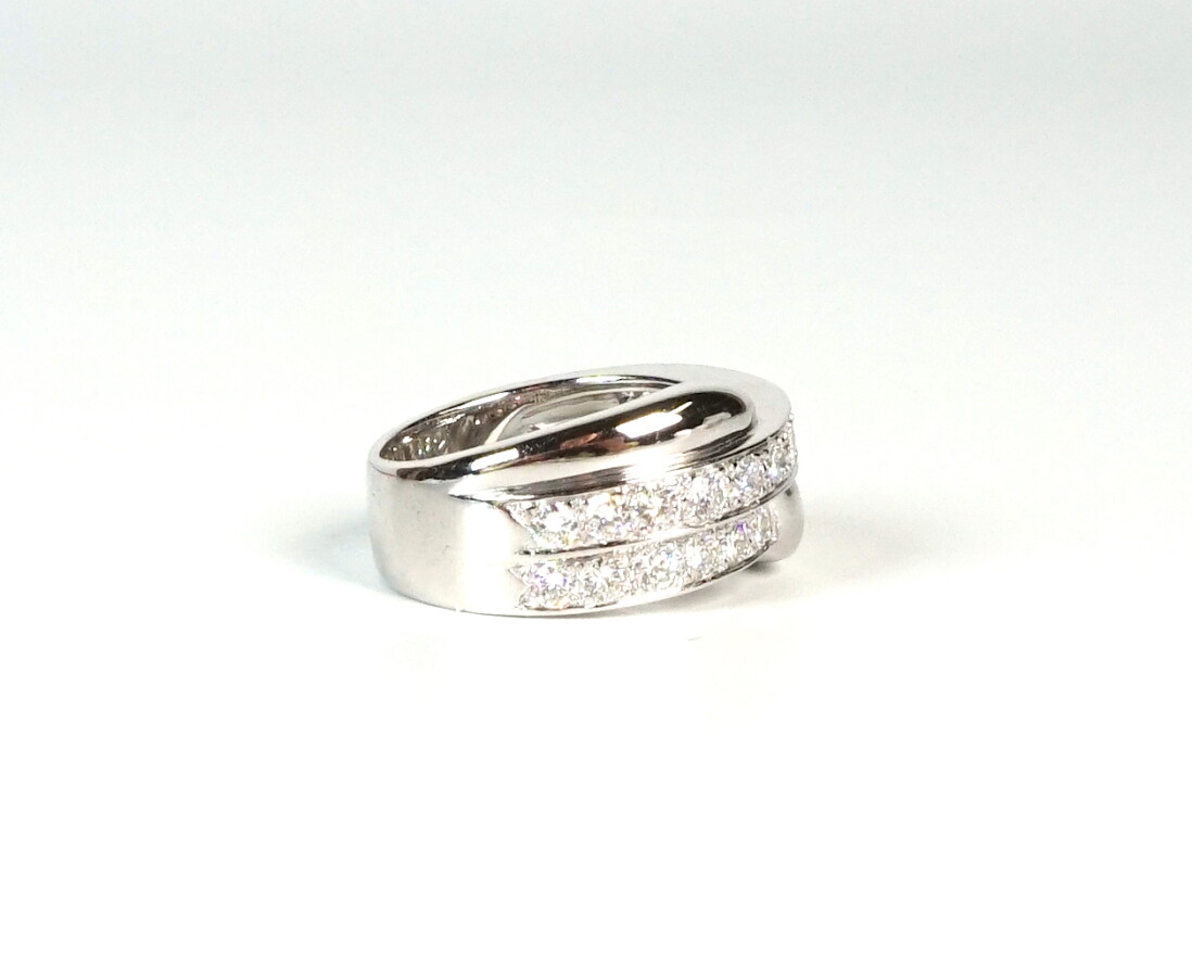 Bague "Bandeau" en or blanc 18K (750/oo) formée d'un jonc sinueux et de 2 lignes serties de diamants ronds calibrant ensemble 2 cts environ. Lar. bandeau : 9 mm. TDD 51. Poids brut : 9.15 g environ.