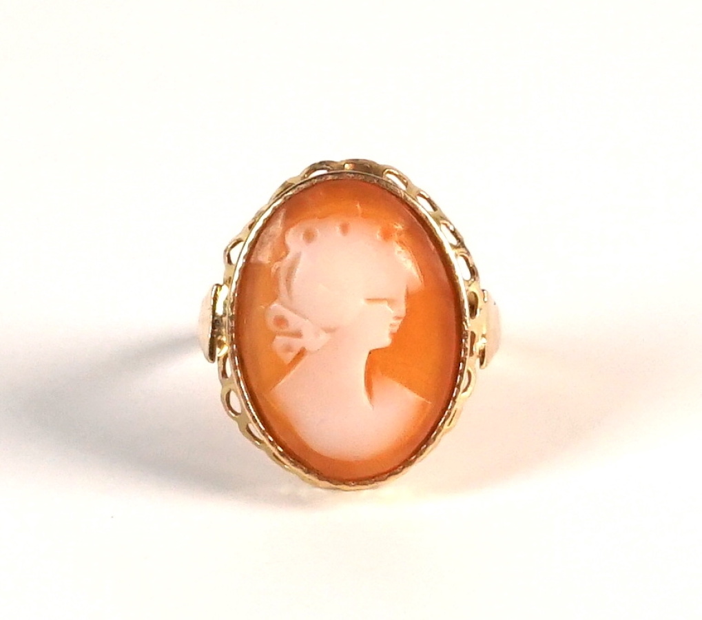 Bague "Camée" en or jaune 18 K (750/oo) à décor d'un profil de femme. TDD 49. Poids brut : 2.9 g environ.
