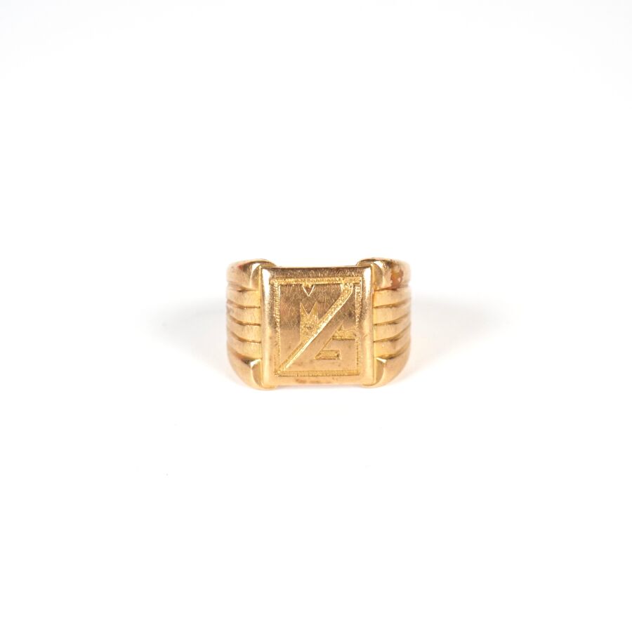 Bague "Chevalière" en or jaune 18K (750/oo), le plateau carré monogrammé "MG". TDD 46. Poids brut : 7.4 g environ.