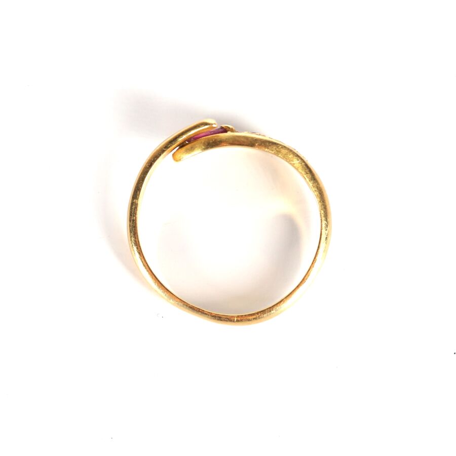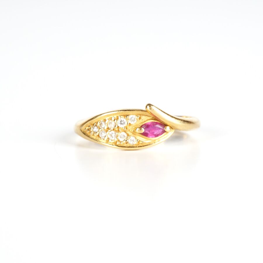 Bague "Cobra" en or jaune 18K (750/oo), la tête sertie d'un rubis taille navette (D. 4.5 x 3 mm) dans un entourage de 9 petits diamants taille brillant, TDD. 57. Dim. Tête de bague : 1.5 x 0.65 cm. Poids brut : 3 g environ.