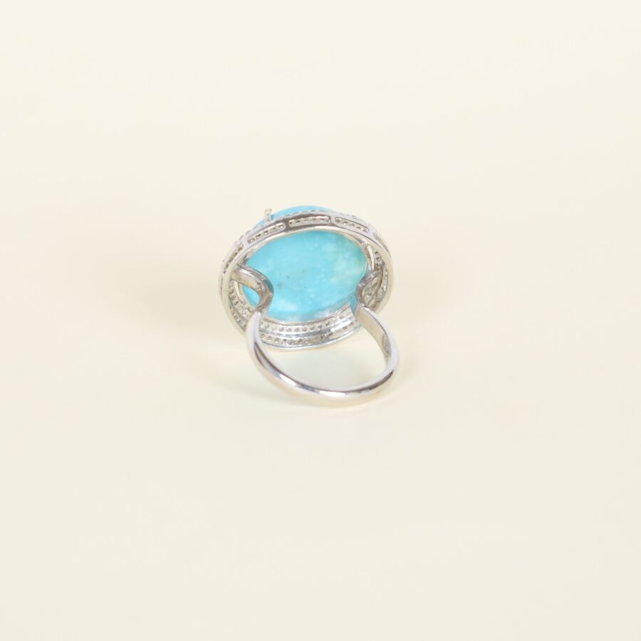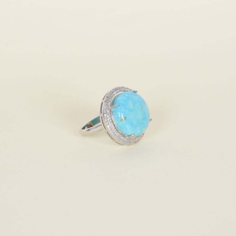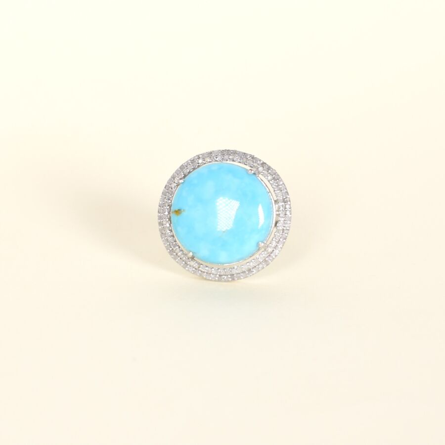 Bague "Cocktail" en argent (925/oo), centrée d'une belle turquoise ronde taille cabochon (Dim. 20 x 20 mm), en serti griffe, dans un entourage de double rayon diamanté, TDD : 58. Poids brut : 9.2 g environ.
